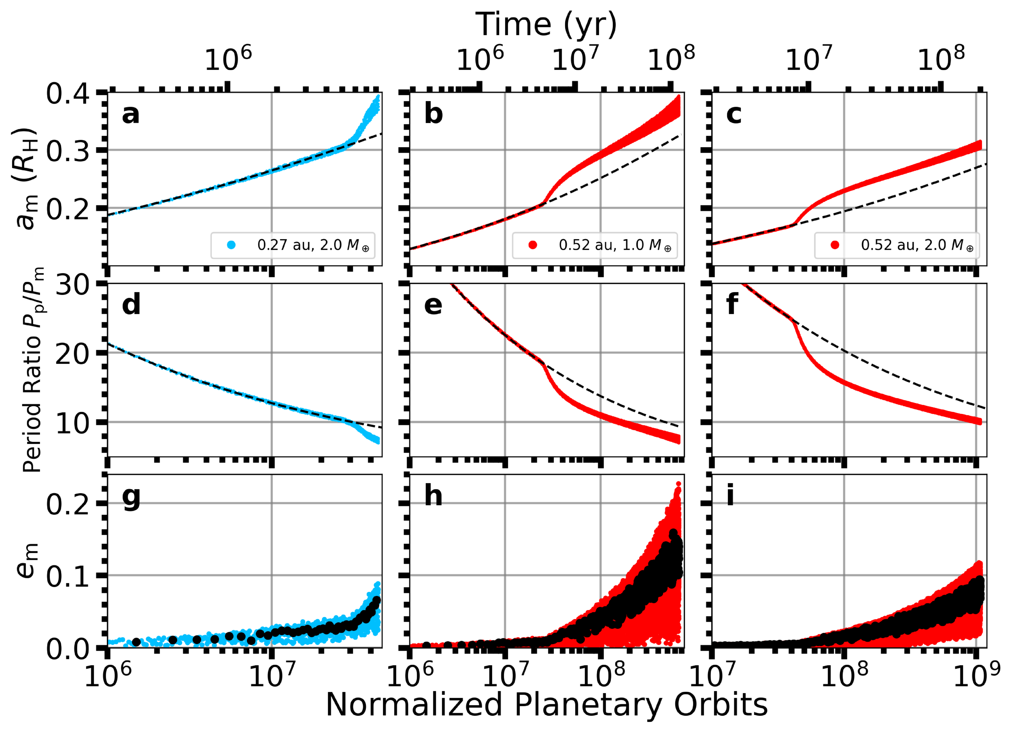Time series plot for three HZ planet–moon systems orbiting an M0 dwarf. Same as Figure 3 but for moons in an M0 system. The three distinct points used are (0.27 au and 2.0 M⊕, 0.52 au and 1.0 M⊕, 0.52 au and 2.0 M⊕). The bottom x-axis uses 0.27 au as the inner edge of the HZ for normalization.