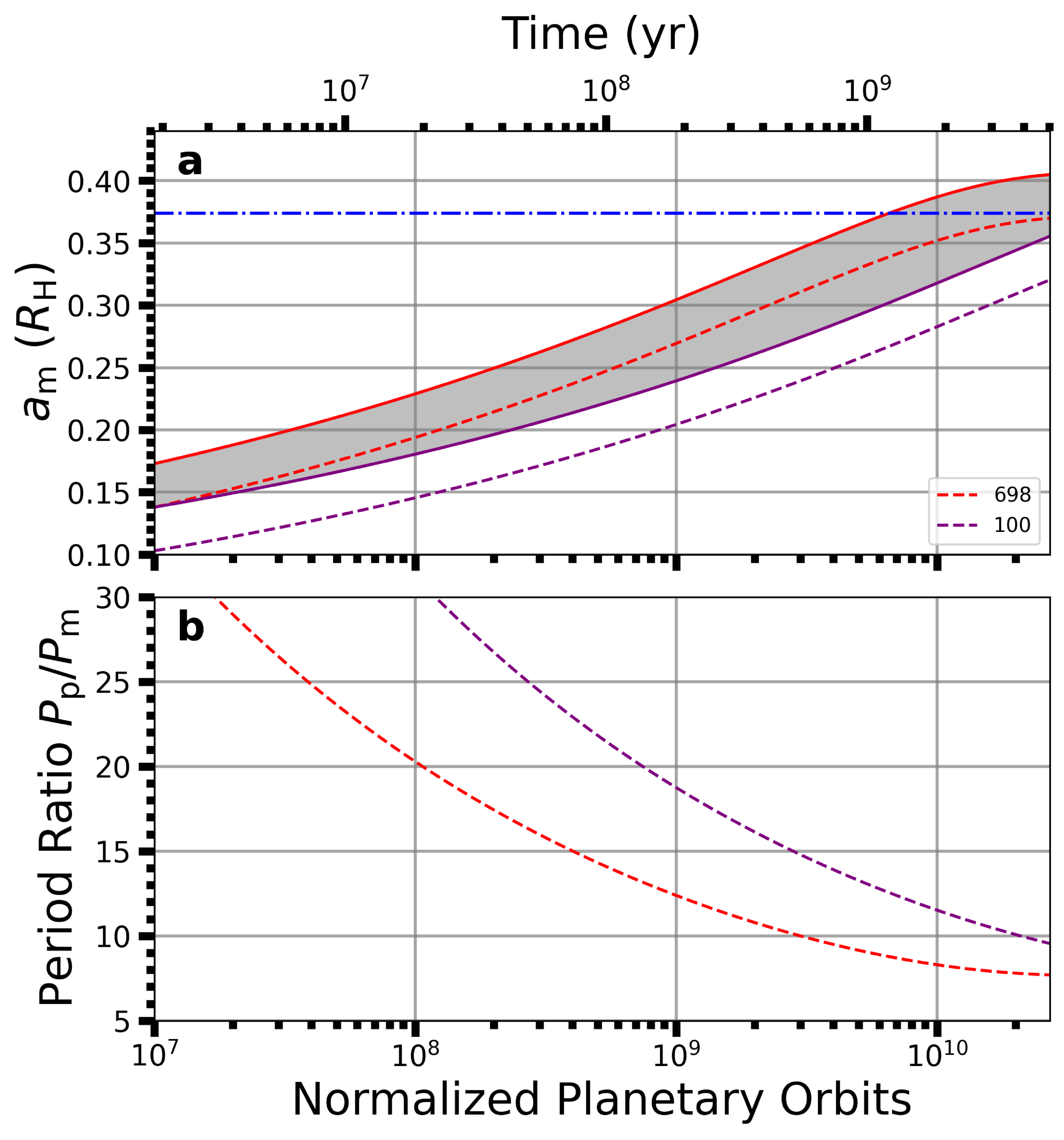 Secular evolution of one HZ planet–moon system orbiting an M0 dwarf. Time evolution of the (a) exomoon’s semimajor axis am and (b) planet to moon period ratio Pp/Pm for one case in the M0 parameter space (0.52 au, 2.0 M⊕) using secular tidal theory. The bottom x-axis, plotted on a logarithmic scale, shows time normalized by the orbital period of a planet at the inner edge of the HZ (0.27 au) while the top x-axis shows time (in years). The red and purple dashed lines represent a τp of 698 and 100 s, respectively, while the red and purple solid lines represent those curves with the added bump of 0.035 RH, accounting for expected MMR and three-body effects. The gray-shaded region represents the area of expected curves between the boosted 698 s upper limit and boosted 100 s lower limit while the blue dashed–dotted line represents the moon’s stability limit.