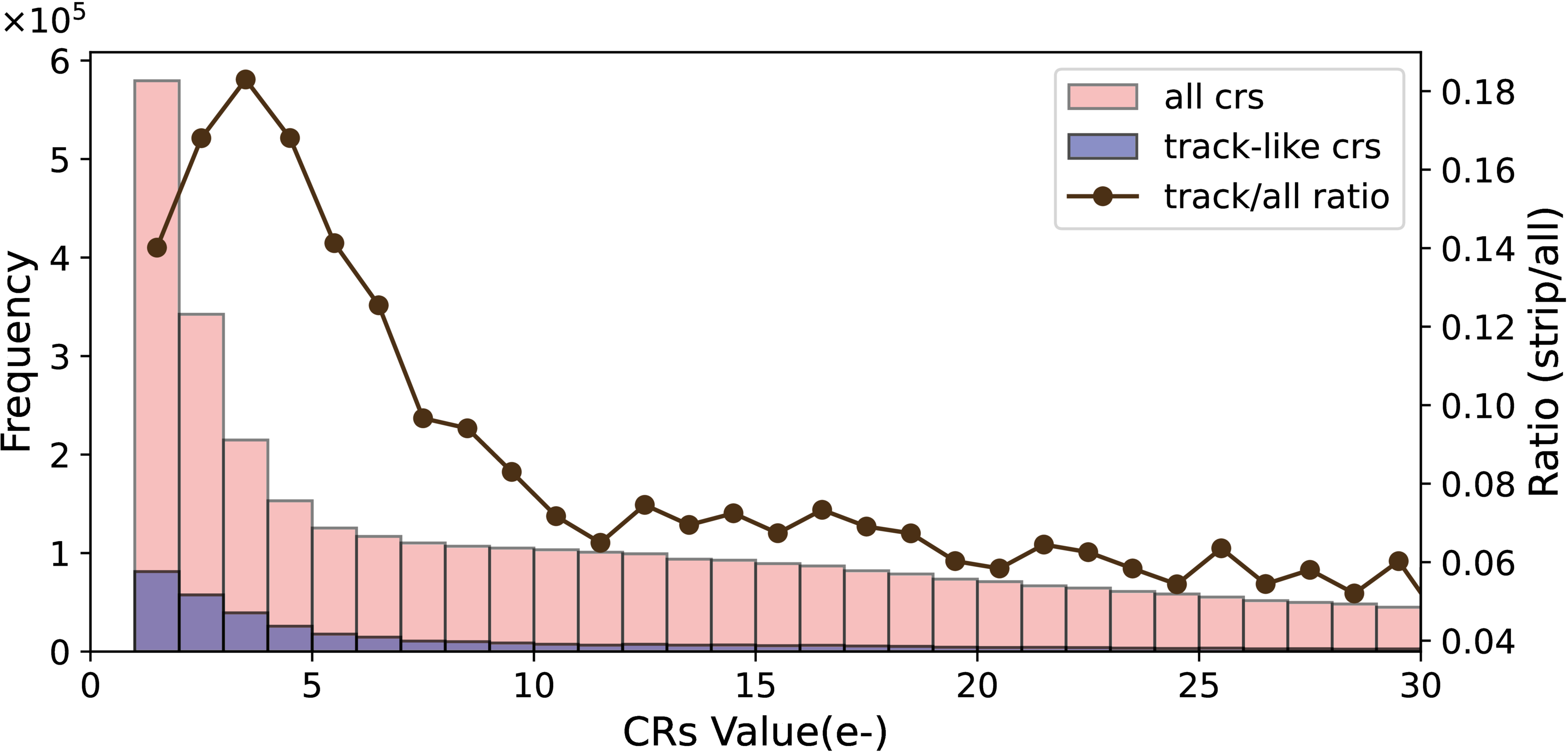CR intensity distribution from simulated images. The left y-axis displays frequency distributions: brown bars represent all CRs, while purple bars represent track-like CRs. The right y-axis shows the ratio of track-like to all CR counts (black line).