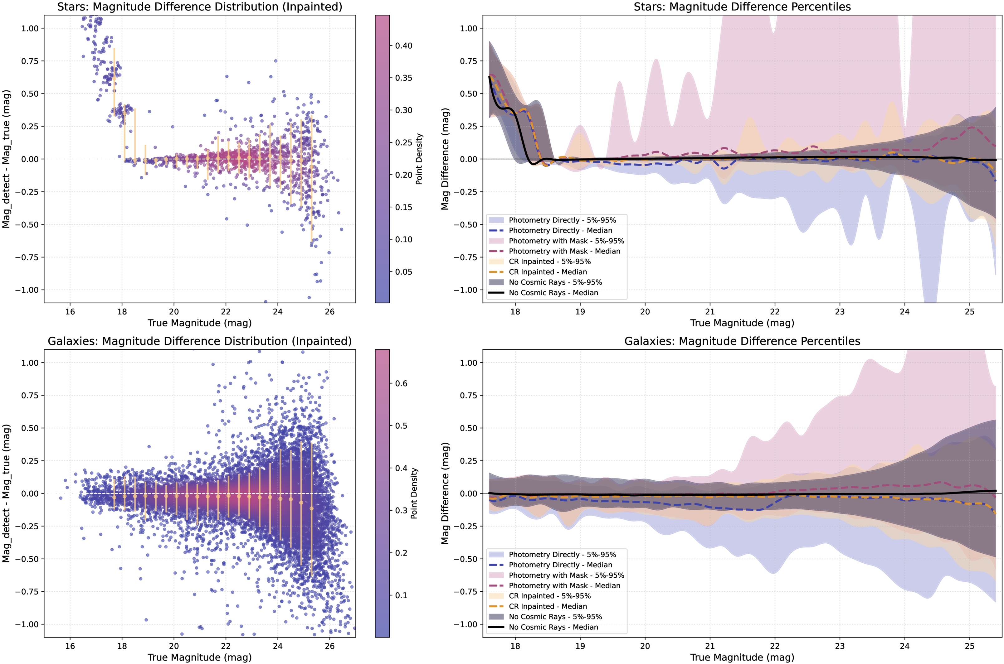 Photometric error distributions for CR affected stars (top) and galaxies (bottom) from full frames. The left column displays scatter plots of magnitude difference (measured—true magnitude) vs. true magnitude for CR-contaminated sources processed with inpainting techniques. Points are color-mapped by local density (blue: sparse, red: dense) with overlaid binned statistics (5th/50th/95th percentiles) shown as gold error bars. The right column compares percentile trends across four CR handling methods: traditional photometry without correction (blue), masked photometry (pink), inpainted photometry (orange), and CR-free reference data (black). Shaded bands represent 5th–95th percentile ranges and lines indicate medians.