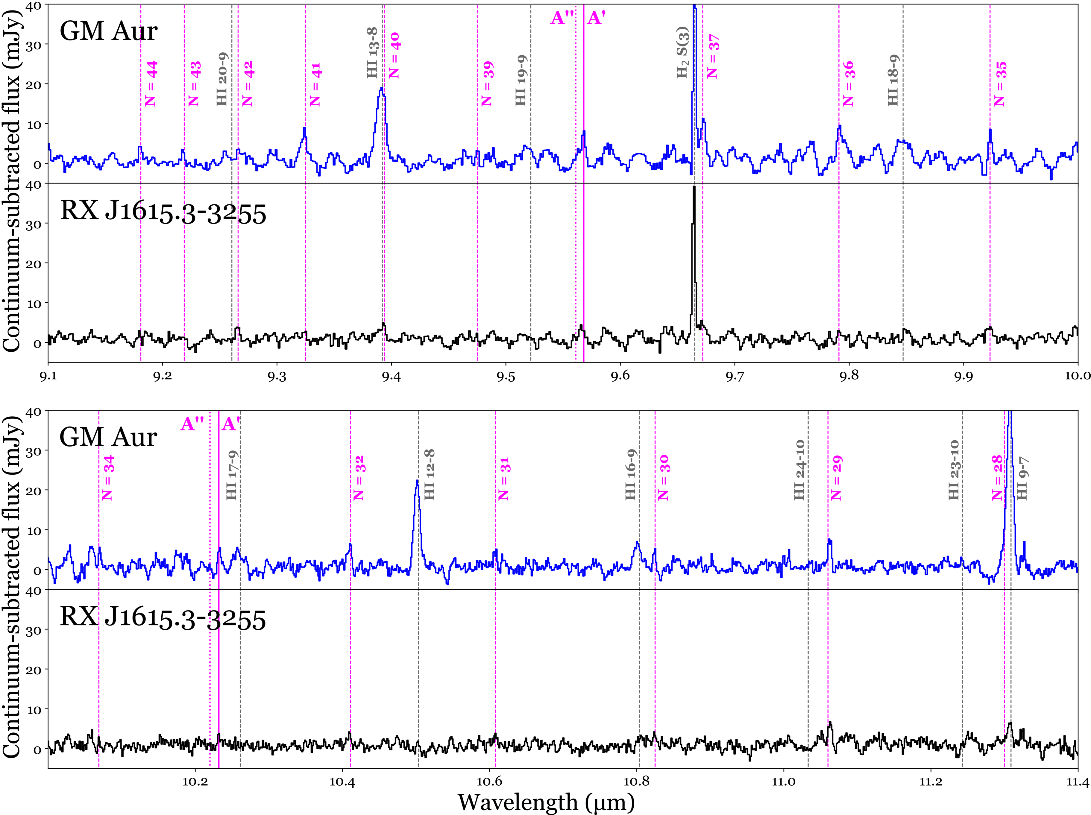 The 9–10 μm and 10.1–11.5 μm segments of the JWST-MIRI MRS spectra of GM Aur (blue) and J1615 (black). H I and H2 lines are labeled with vertical gray dashed lines. The locations of OH emission lines are indicated with vertical pink lines alongside their associated quantum number. ﹩{A}^{{\prime} }﹩ and A″ symmetry lines are labeled, with the former being a strong indicator of prompt emission. The higher detection rate of OH lines in GM Aur over J1615 (see Section 3.1.5) suggests that the photodissociation of H2O into OH is more important in the disk of GM Aur than J1615.