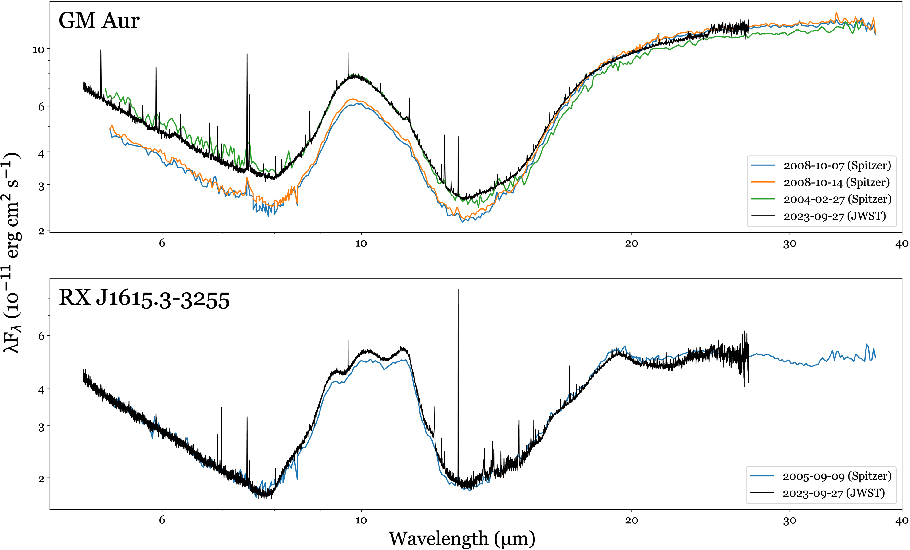 JWST-MIRI MRS spectra (black lines) of GM Aur and J1615 plotted alongside their respective archival Spitzer spectra (colored lines). GM Aur shows continuum variability in the shorter wavelengths, while J1615’s continuum level is consistent between Spitzer and JWST observations.