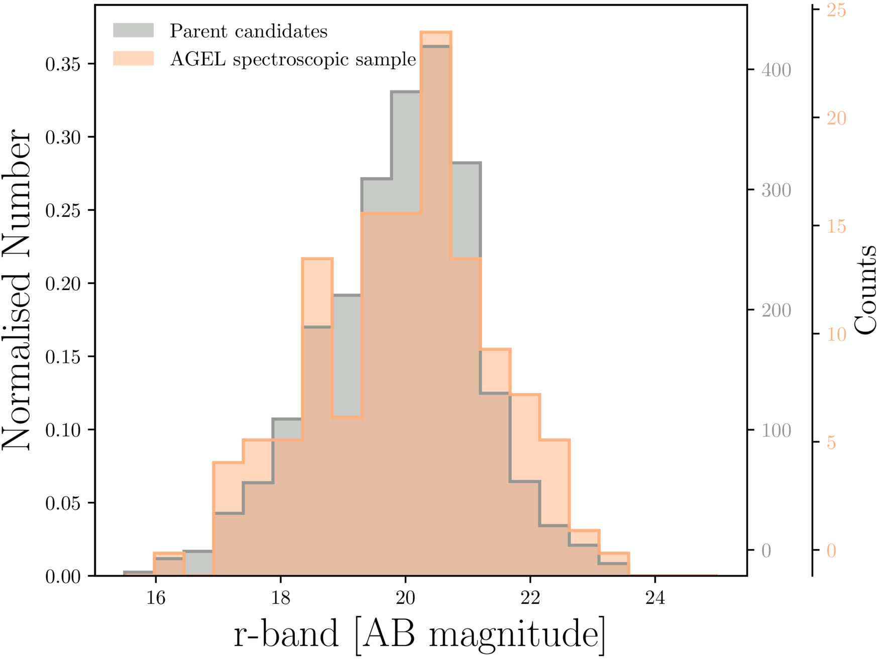 Number density histogram of deflector r-band magnitudes. The AGEL parent candidate sample from C. Jacobs et al. (2019a, 2019b), X. Huang et al. (2020, 2021) is shown in gray, with the spectroscopic sample in orange. Based on 1000 realizations of the parent sample, we find the two distributions statistically consistent.