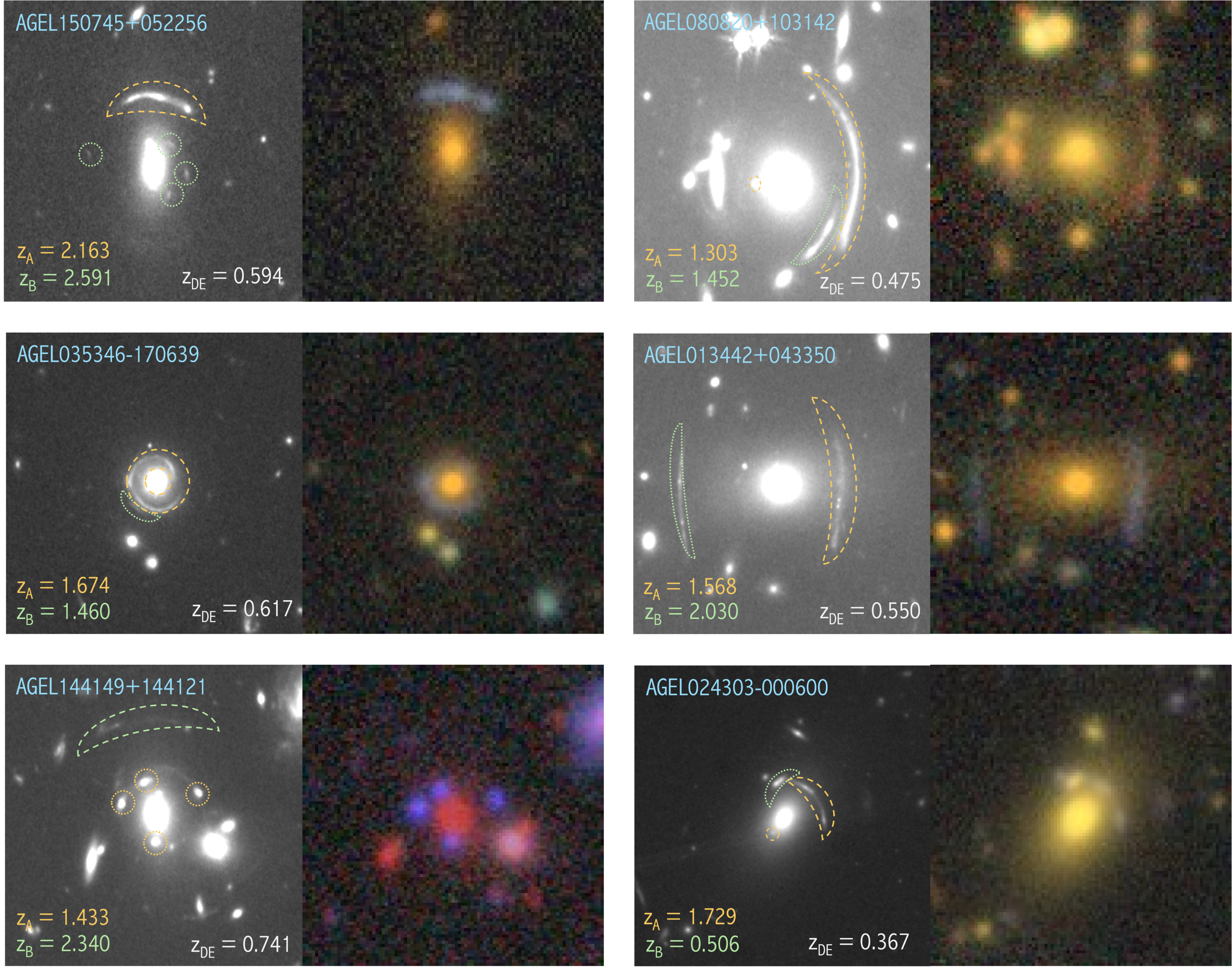Galaxy-scale multisource lenses, with the HST/F140W image in the left column and DECaLS grz in the right column. Arc A is highlighted by the orange dashed shapes and arc B by the green dotted shapes. The redshifts are labeled in the HST panels. All images are 25 × 25″ and are oriented with north up and east left.
