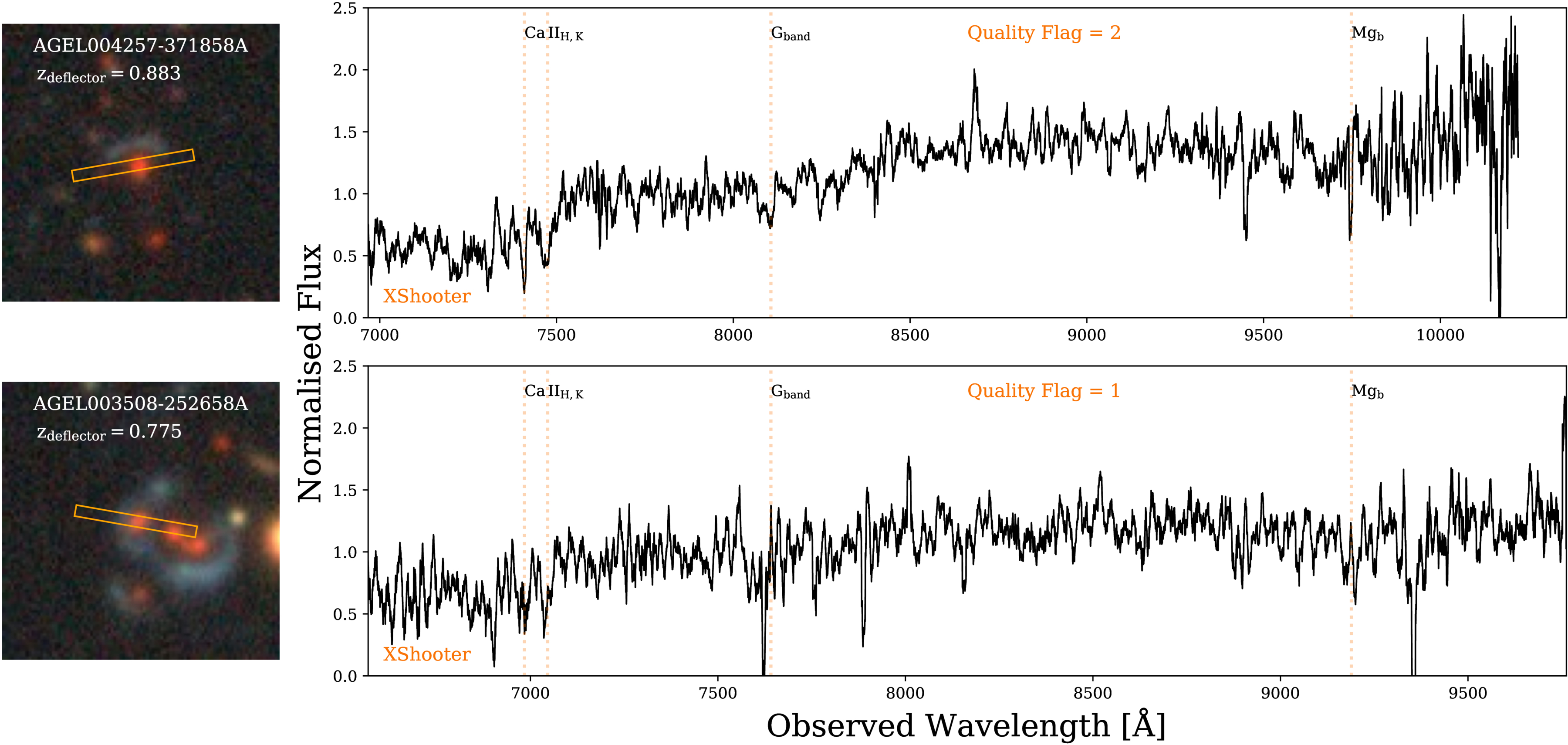 Example AGEL spectra of varying redshift quality flags. The top row is a deflector spectrum from X-shooter with redshift quality flag = 2, and the bottom row is a deflector spectrum from X-shooter with quality flag=1. grz 25″ × 25″ DECaLS images are shown in the left column with north oriented up and east left. Key spectral features used in the redshift measurement are shown with dotted orange lines. The slit position is shown as an orange rectangle overlaying the DECaLS image.