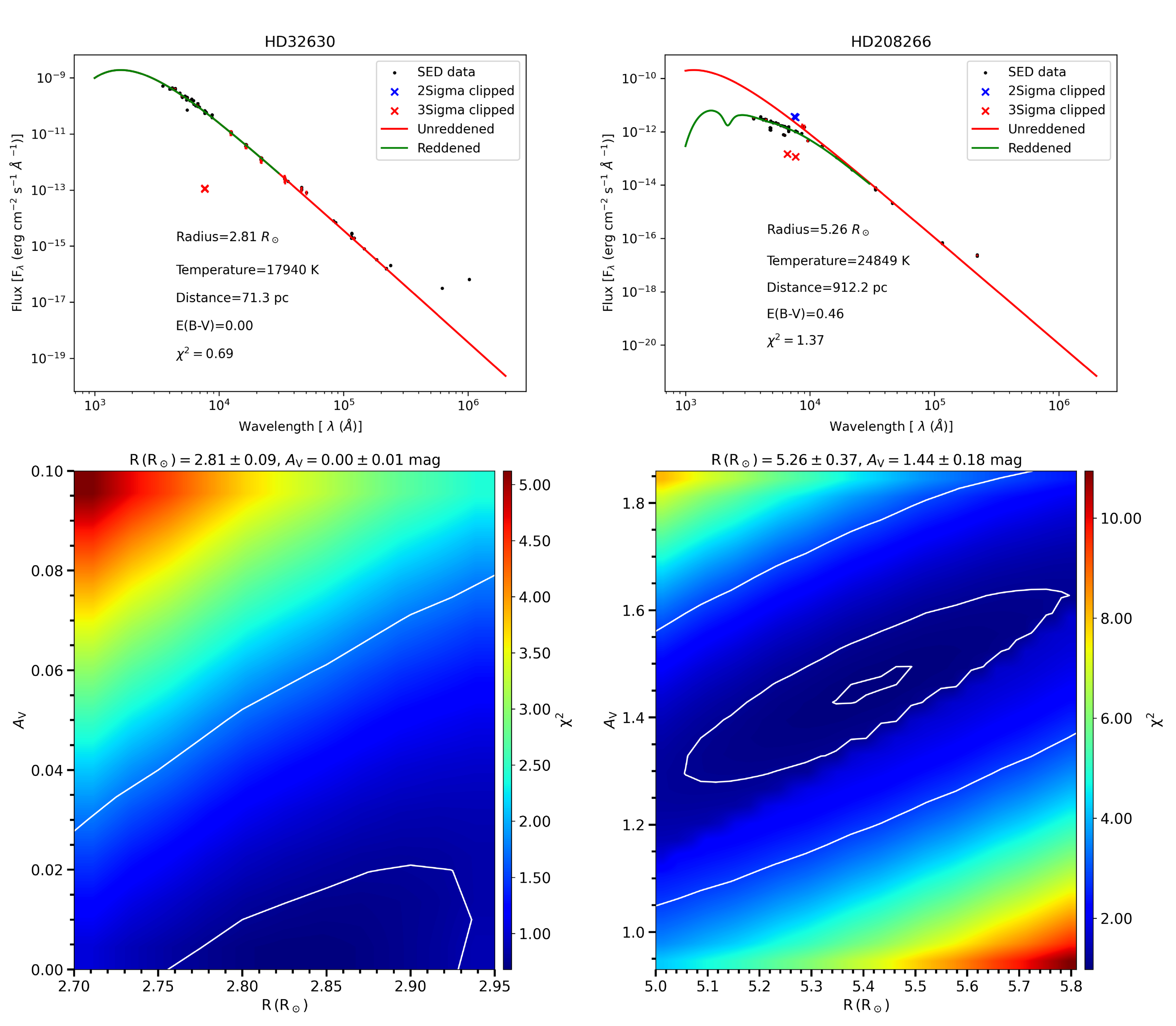 Top panel: SED models of two stars (HD 32630 and HD 208266) with different interstellar extinctions. Bottom panel: χ2 map of models given in the top panel.