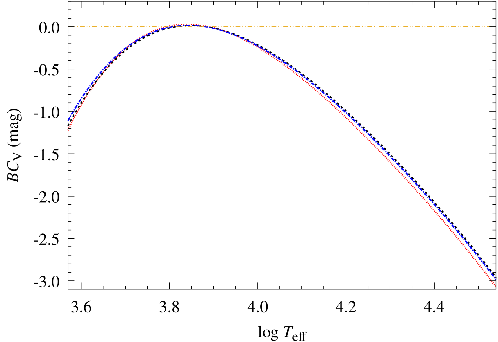 Curves of the analytical BCV–Teff relations in Table 7. The black dashed curve uses Sλ(V) from M. S. Bessell (1990), the blue dashed–dotted curve uses Sλ(V) from A. U. Landolt (1992), and the red dotted curve is the photometric BCV–Teff curve.