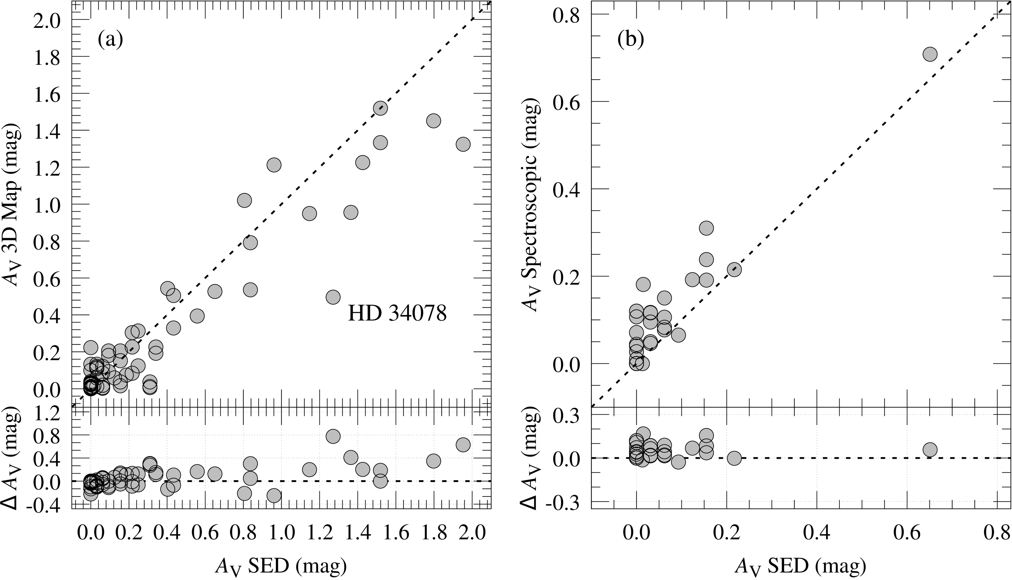 (a) Comparison of interstellar extinctions (AV) of the SED method to the ones from the 3D Galactic dust maps (G. M. Green et al. 2019). (b) Comparison of computed spectroscopic AV to AV from the SED analysis.