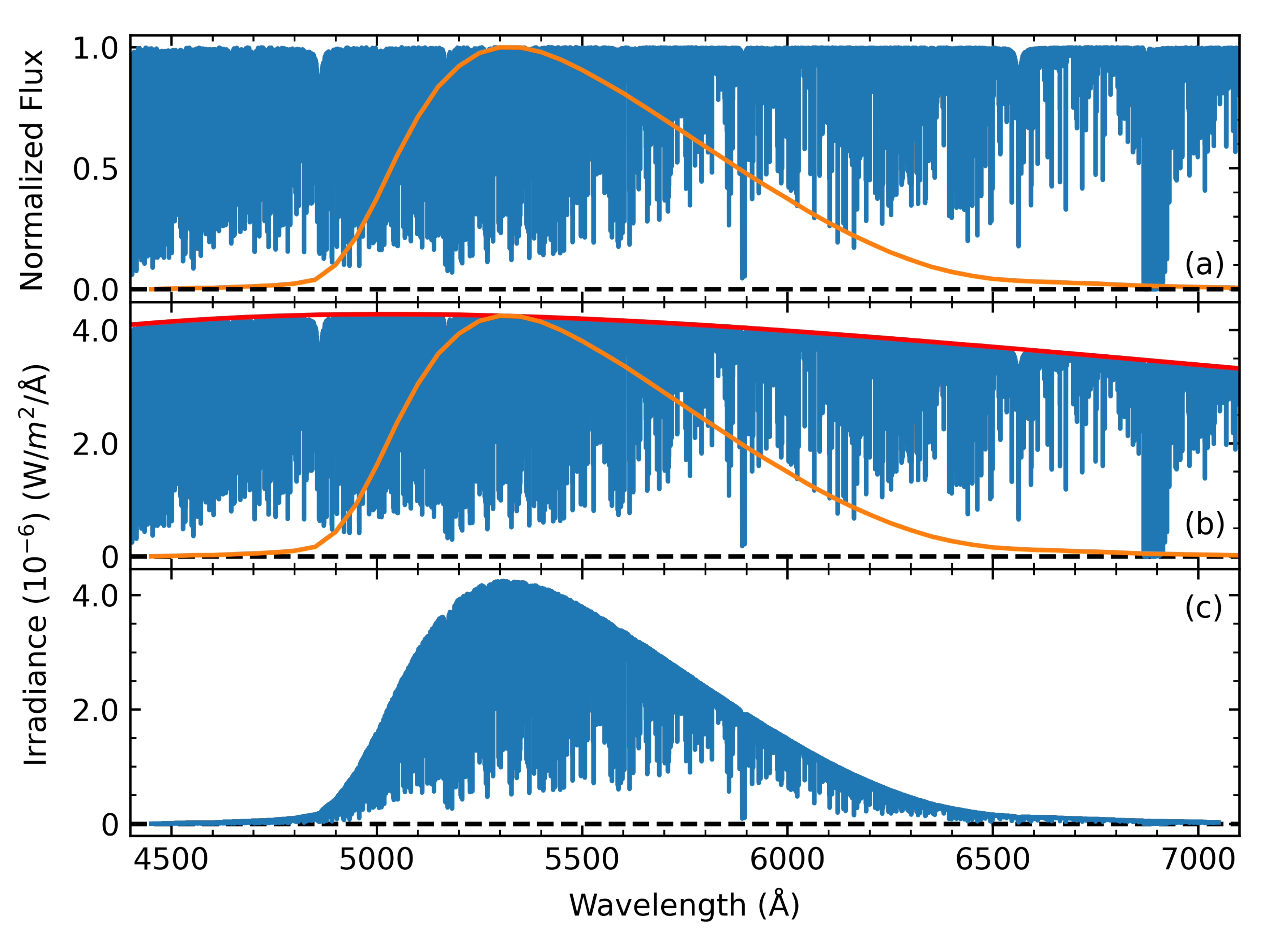 Normalized solar spectrum and V filter profile (a), denormalized flux and V filter spectra (b), and the convoluted spectrum of the Sun (c). Dividing the area under the convoluted spectrum by ﹩\sigma {T}_{{\rm{eff}}}^{4}(\odot )﹩ gives solar LV/L = 10.49% or 10.19% for the M. S. Bessell (1990) and the A. U. Landolt (1992) profile functions, respectively.