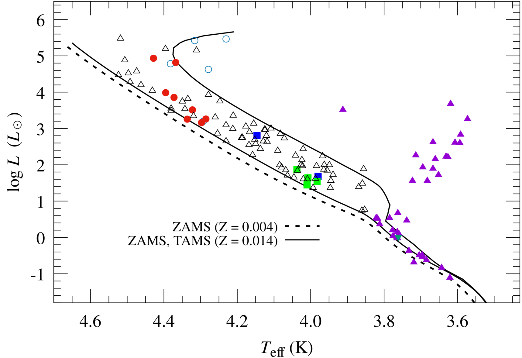 Distribution of the sample stars on the H-R diagram. ZAMS and TAMS, according to PARSEC evolution models (A. Bressan et al. 2012) are indicated. Symbols: △, HERMES;