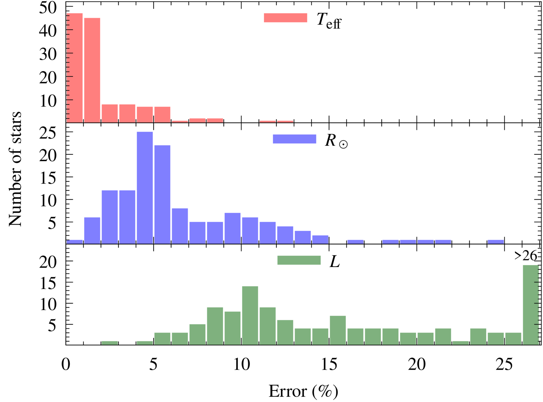 Uncertainty histograms of Teff (top), R (middle), and L (bottom).