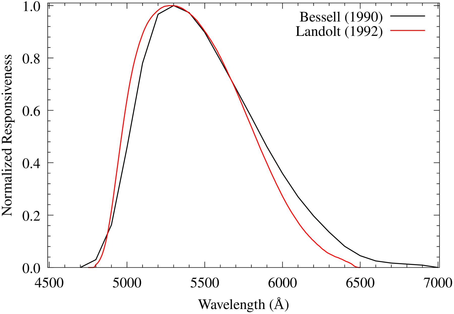 Normalized transparency profiles of the V filter by M. S. Bessell (1990) and A. U. Landolt (1992).