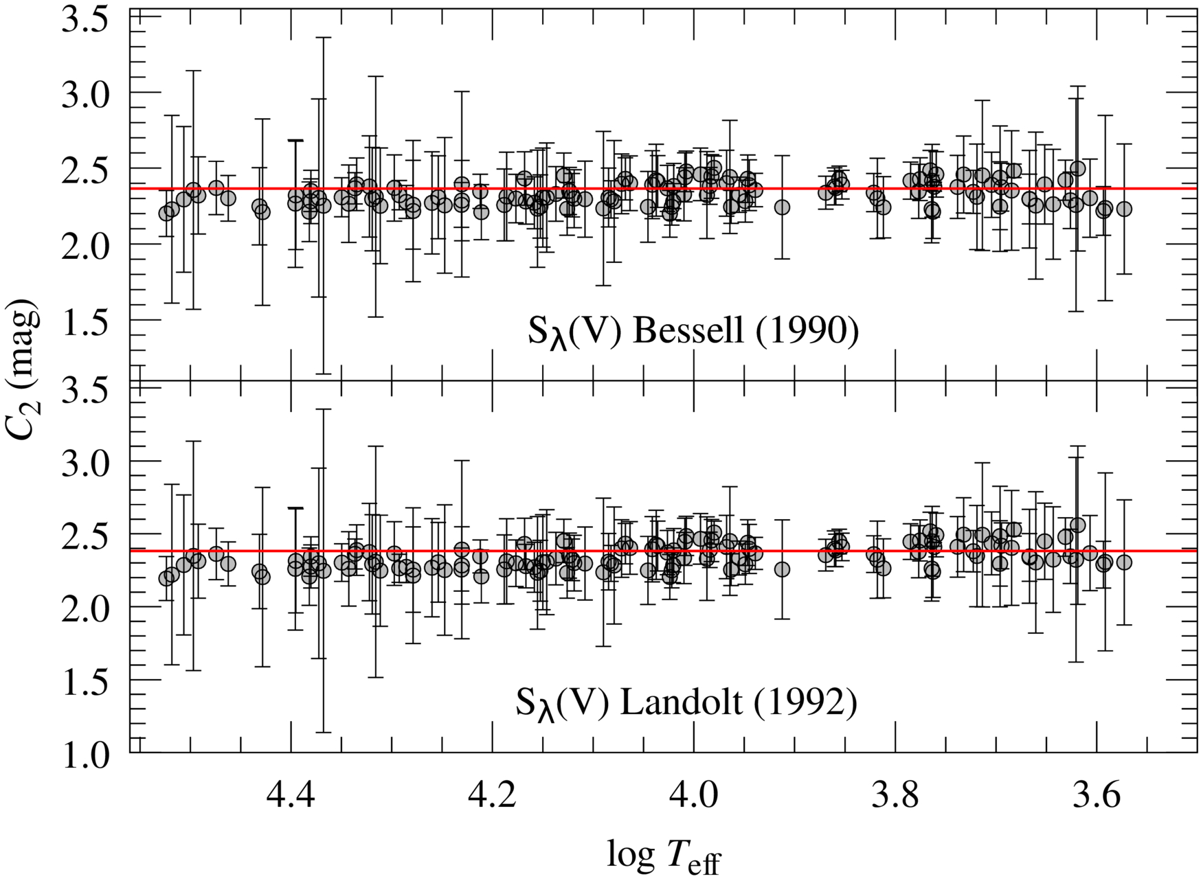 The zero-point constant values for the BCV scale from the sample spectra containing 128 stars. Error bars are the propagated errors from the observational uncertainties. Horizontal lines mark the values of the weighted mean: C2 = 2.3653 if the Sλ(V) function of M. S. Bessell (1990) is used and C2 = 2.3826 if the Sλ(V) function of A. U. Landolt (1992) is used.