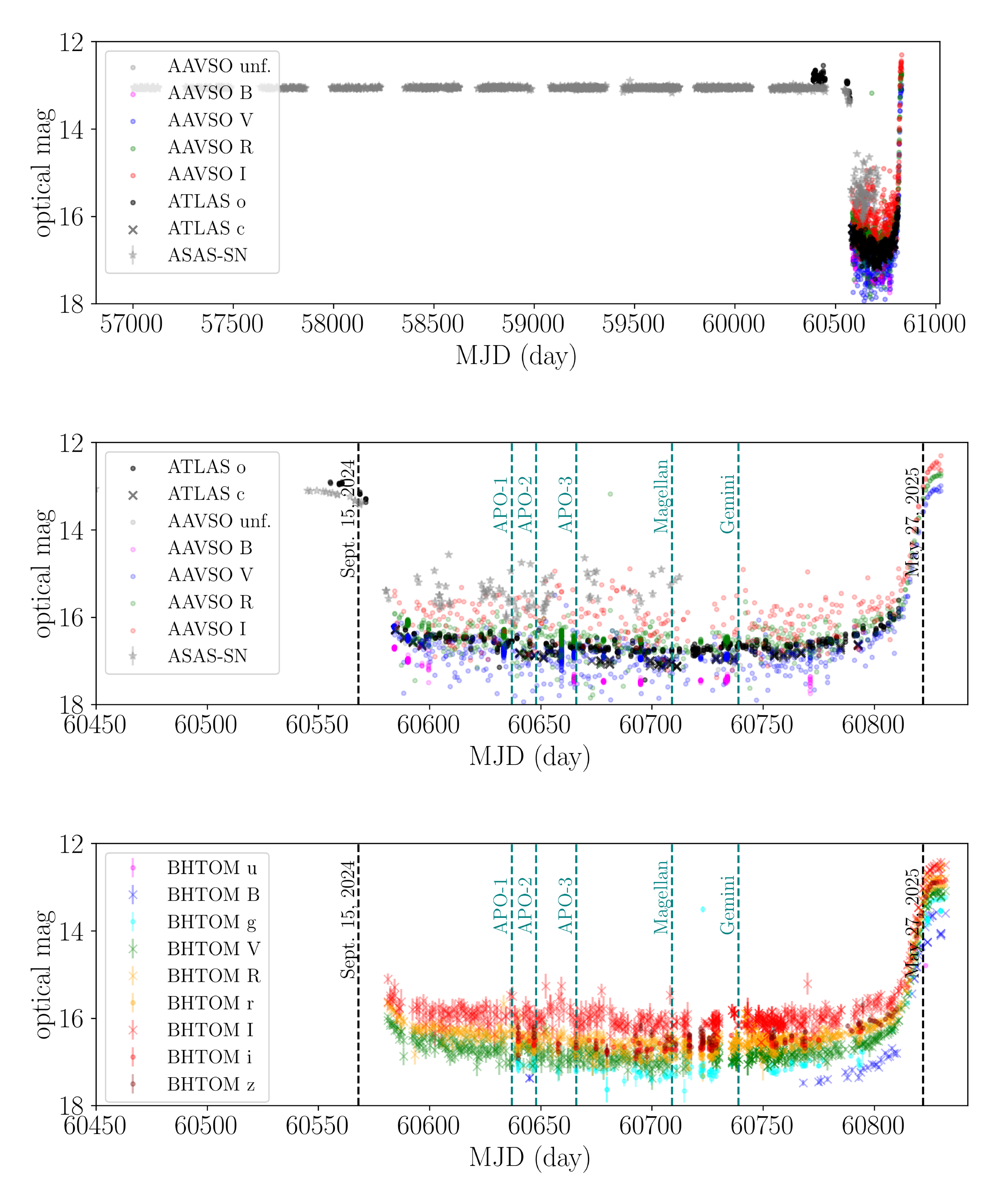 Top: the ASAS-SN lightcurve of J0705+0612 in the last 10 yr. Middle and bottom: zoom-in view of the last few months with a collection of follow-up photometry. The black dashed line at MJD 60568 (2024 September 15) marks when the dimming becomes apparent in the lightcurve and the one at MJD 60822 (2025 May 27) marks the corresponding point of the egress. Teal lines mark our follow-up spectroscopy epochs.