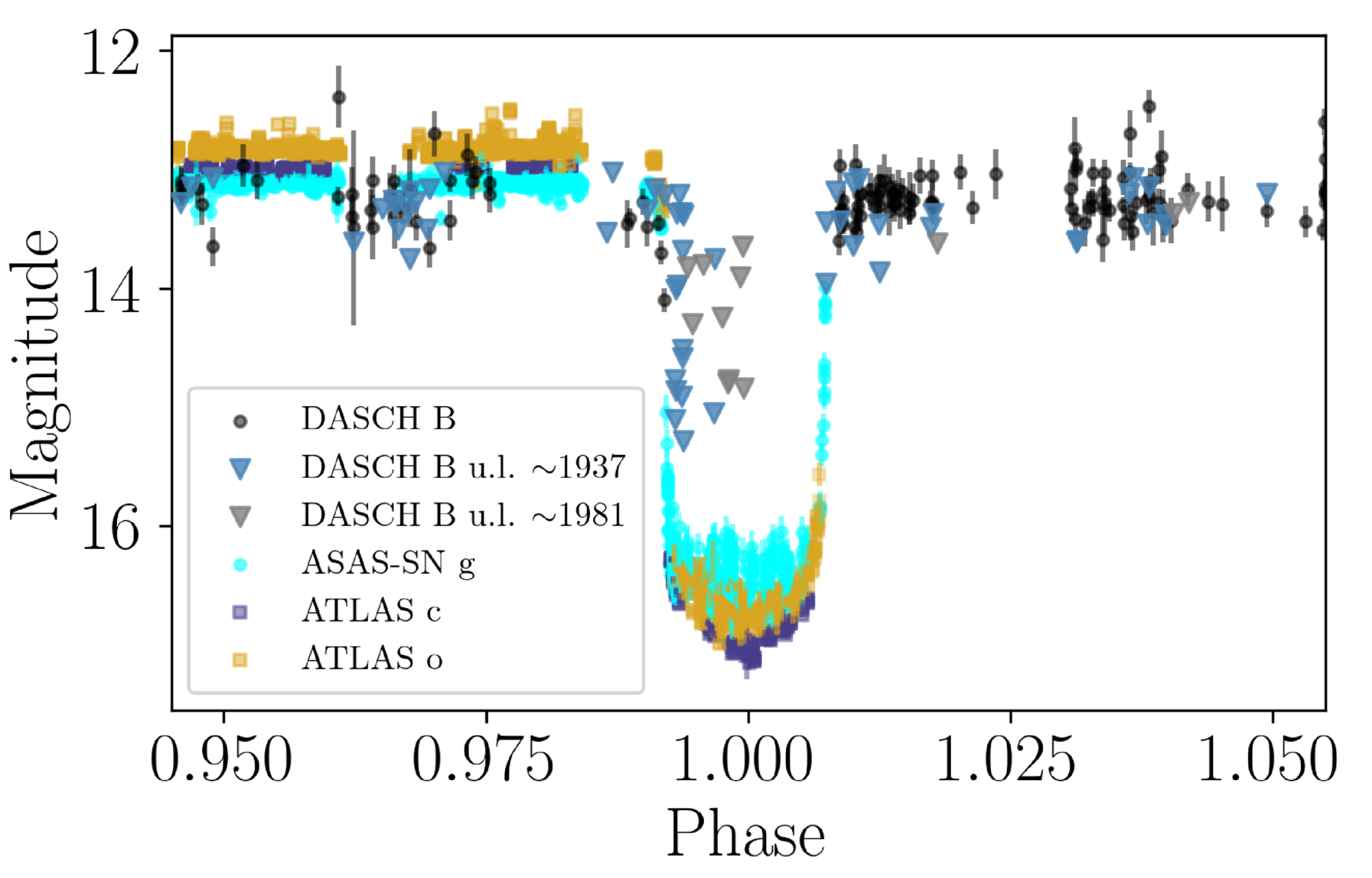 Historic (DASCH, including upper limits) and modern lightcurves phase folded at P = 15,999 days. The 1937 ingress was captured by one data point, enabling a high-precision period determination. Triangles mark DASCH upper limits.