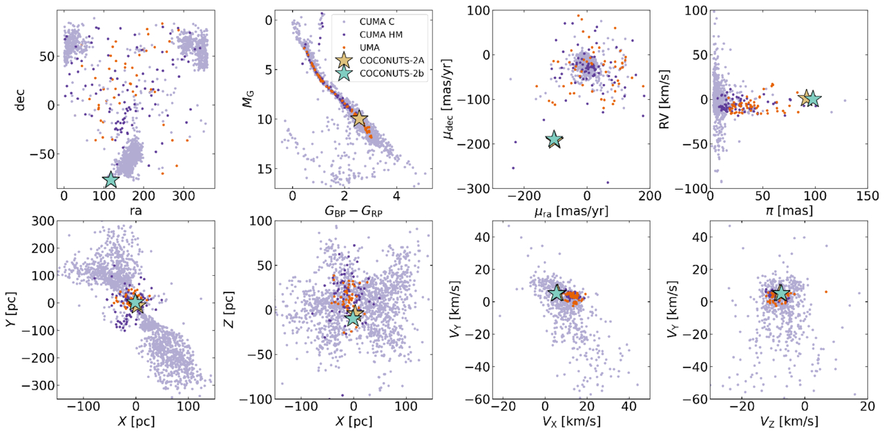 Astrometric and photometric plots for the members of CUMA. The top row shows R.A., decl., the Gaia color–magnitude diagram, PM R.A. (μR.A.), PM decl. (μdecl.), radial velocity, and parallax (π). The bottom row shows the 3D Galactic positions (X, Y, Z) and the 3D Galactic velocities (VX, VY, VZ). We show in light-purple the candidate members (“CUMA C”) and in purple the high-likelihood members (“CUMA HM”). We obtained these classifications from the MOCA database. We also include in orange the members of the UMA cluster from B. K. Capistrant et al. (2024). In a yellow star we show COCONUTS-2 A, and in green COCONUTS-2 b. We find that the components of COCONUTS-2 agree well with the cluster in 3D velocity and position, while staying closer to each other, confirming that they are a binary.