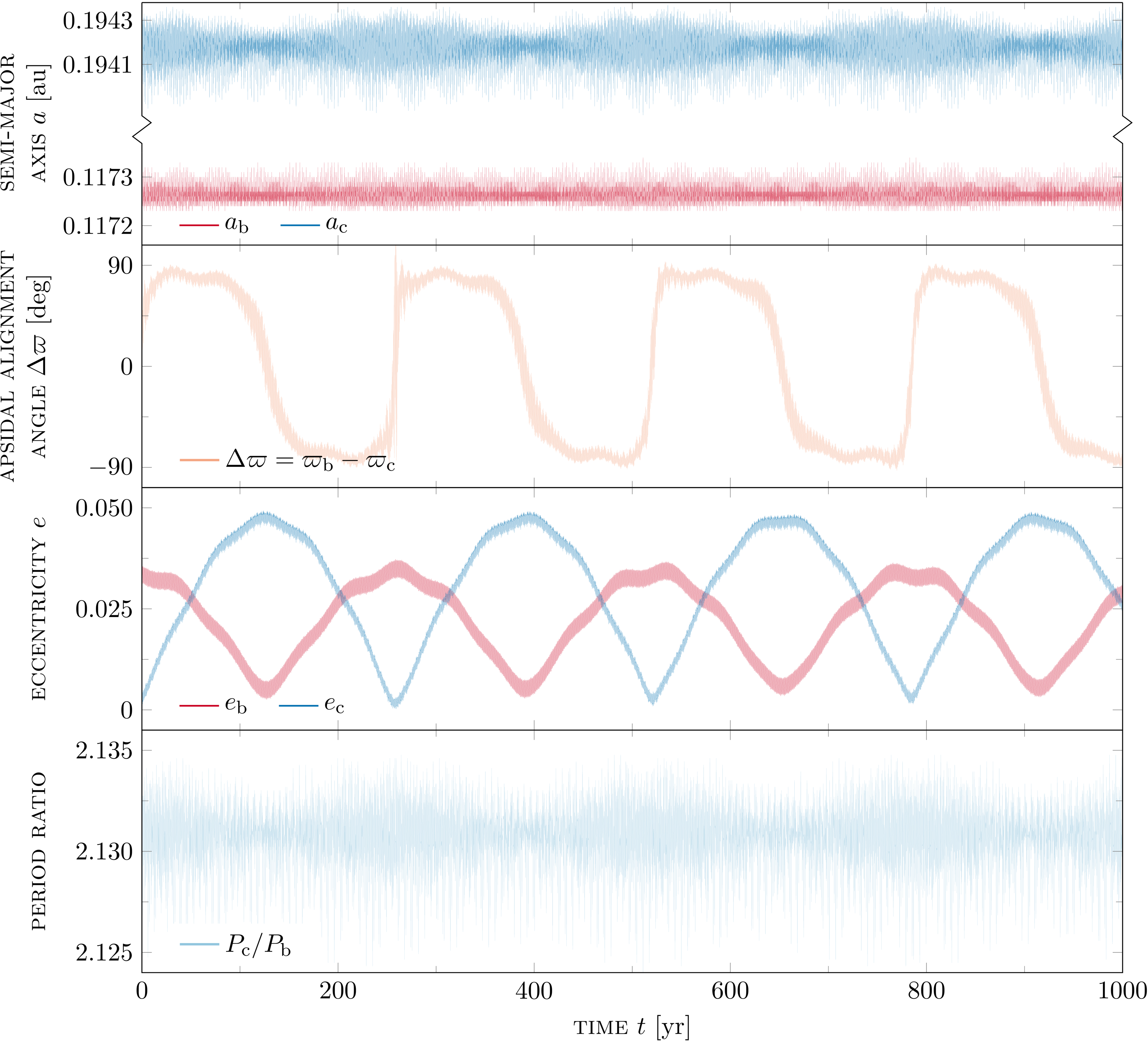 Orbital evolution of the TOI-1232 system for a 1000 yr–long N-body integration using Wisdom–Holman scheme. From top to bottom: panel (1): evolution of the planetary semimajor axes ab and ac. Panel (2): evolution of the apsidal alignment angle Δϖ = ϖb − ϖc. Panel (3): evolution of the planetary eccentricities eb and ec. Panel (4): evolution of the period ratio Pc/Pb. Panel (5): evolution of the angle θ1. The system TOI-1232 is outside of the 2:1 MMR, as no libration in any of the resonance angles is observed and the mean period evolution is osculating significantly above the 2:1 period ratio.