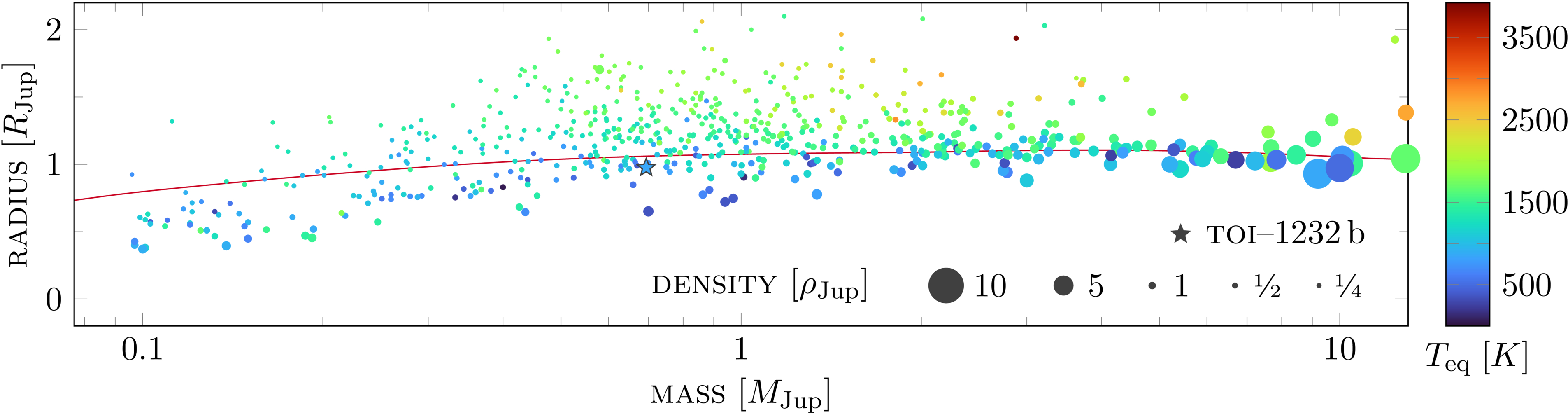 Radius–mass distribution of all giant transiting planets with measured masses from the TepCat catalog. The masses were accessed either by TTVs, RVs, or both. The position of TOI-1232 b is marked with a star symbol. Color coded is the equilibrium temperature. The solid curve indicates the predicted planetary radius based on the models of J. J. Fortney et al. (2007) and consistent with the stellar parameters of TOI-1232.