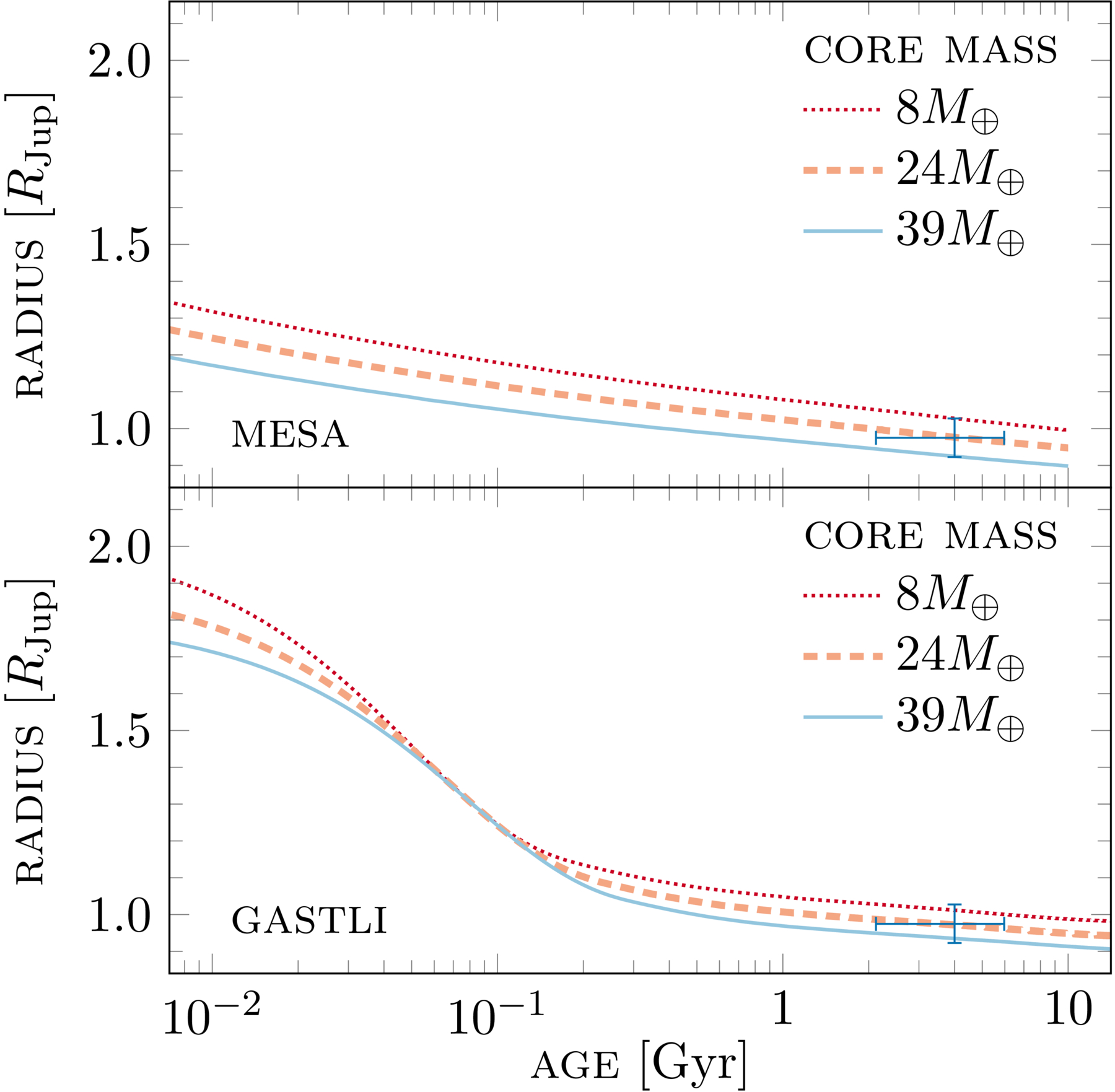 Age–radius diagram using MESA (upper panel) and Gas Giant Model for Interiors (GASTLI; lower panel) models with the position of TOI-1232 b shown in black. Overplotted are three different models with a fixed envelope metallicity (Z = 0.023), and varying core masses.