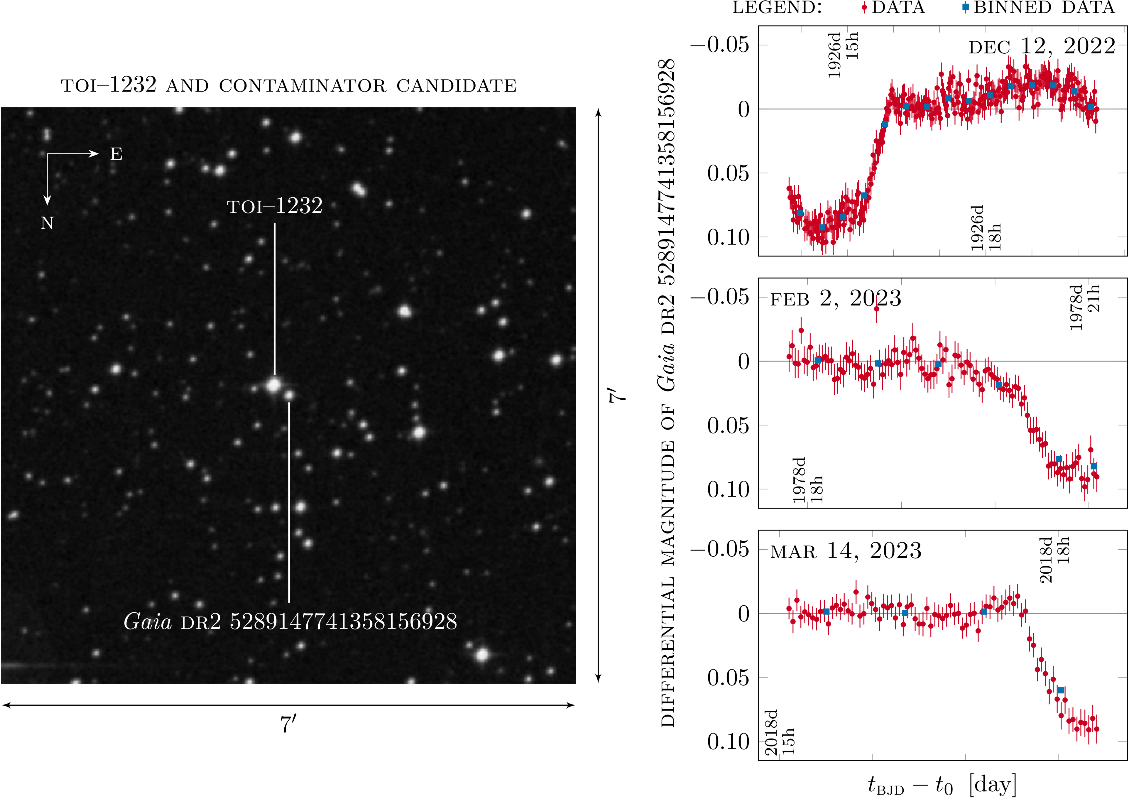Light curves of the contaminator candidate Gaia DR2 5289147741358156928, observed by the 60 cm telescope at El Sauce, showing binary signal eclipses at three predicted times.