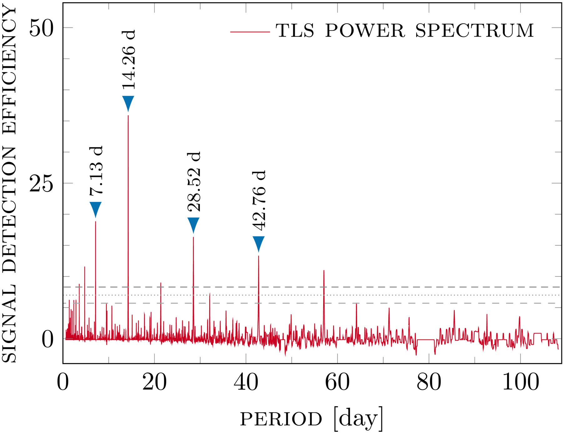 tls periodogram of the detrended and binary corrected TESS light-curve data for TOI-1232. The planetary transit signal at Pb = 14.26 days is accompanied by harmonics at 7.13 days, 28.52 days, and others. Horizontal dashed lines represent the signal detection efficiency (M. Hippke et al. 2019) thresholds of 5.7, 7.0, and 8.3, corresponding to tls false positive rates of 10%, 1%, and 0.1%, respectively.