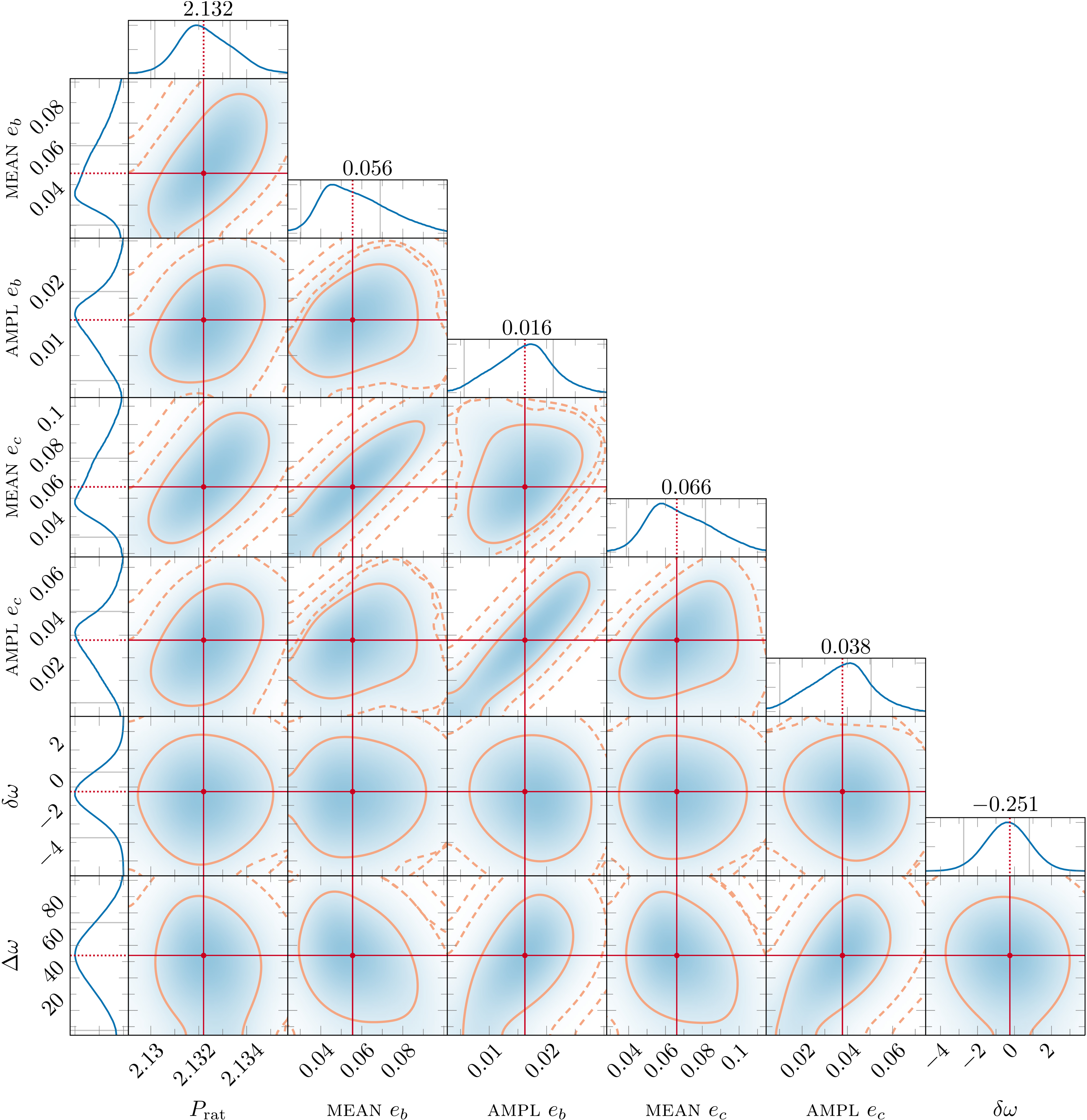 Posterior distributions of the key dynamical parameters near the 2:1 MMR for the two-planet system, derived from a combined TTV + RV N-body model. A total of 10,000 samples were drawn from the posterior distribution and individually tested for long-term stability. The distributions reflect the system’s behavior in the vicinity of the 2:1 period ratio, highlighting the resonant and secular dynamics. We report the median values and peak-to-peak variations of the period ratio (﹩{\hat{P}}_{{\rm{rat.}}}﹩), eccentricities (﹩{\hat{e}}_{{\rm{b}}}﹩, ﹩{\hat{e}}_{{\rm{c}}}﹩), and apsidal angle difference (﹩\hat{{\rm{\Delta }}\omega }﹩), along with their dynamical amplitudes: Ampl. eb, Ampl. ec, and Ampl. Δω. Dynamically constrained planetary masses and semimajor axes are also shown. The resonant angles θ1 and θ2 are omitted as their evolution is dominated by circulation over the full 0°–360° range. Contours in the 2D distributions indicate the 1σ, 2σ, and 3σ confidence intervals of the stable posterior set.