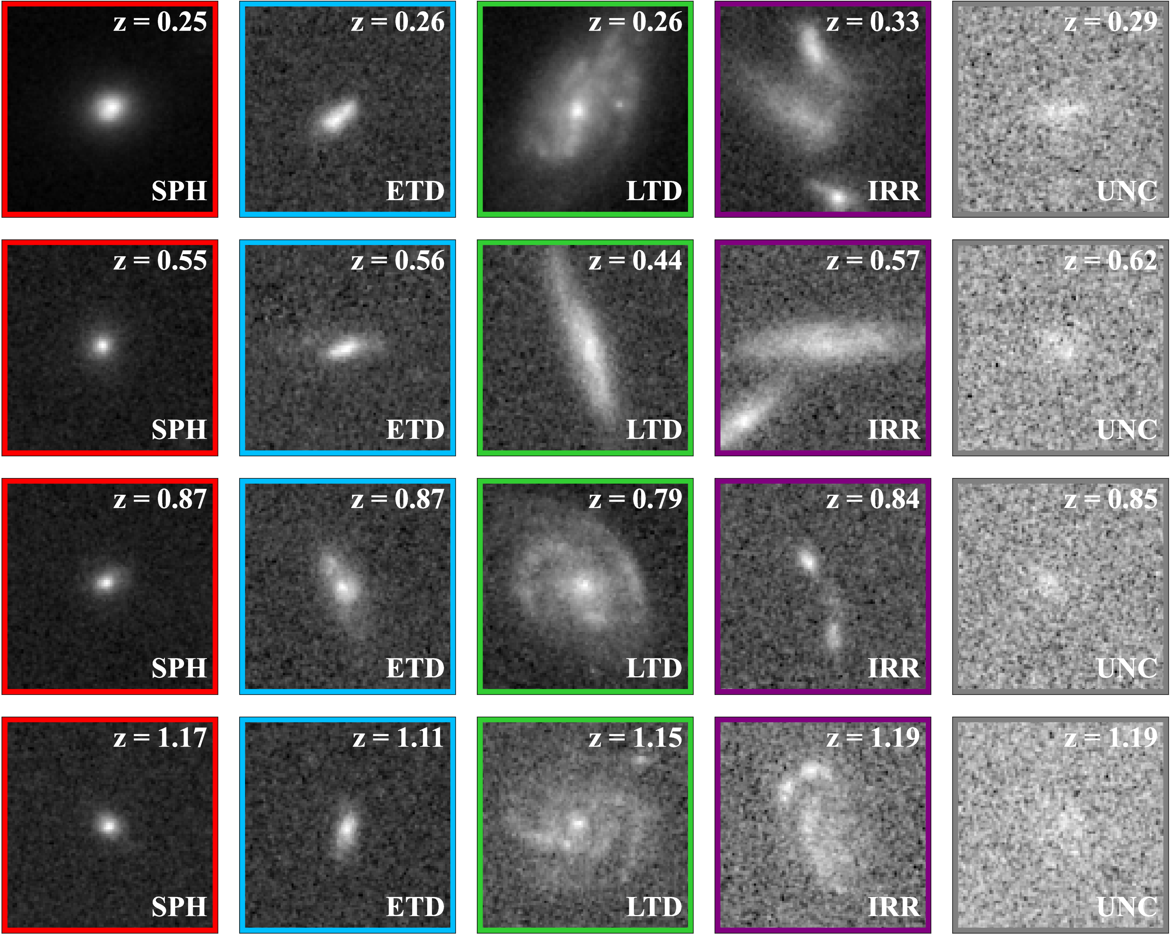 Example images of galaxies randomly selected from the sample. From left to right, images in each column correspond to SPHs, ETDs, LTDs, IRRs, and UNCs, respectively.