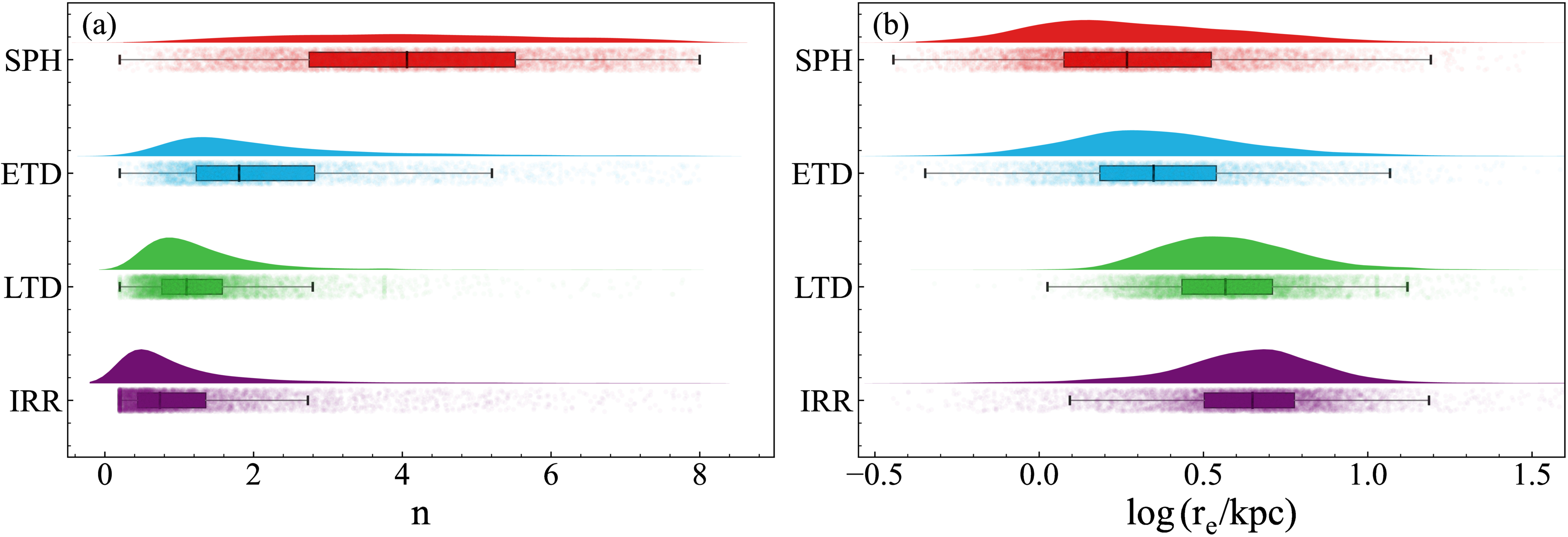 Raincloud plots of the Sérsic index (left panel) versus effective radius (right panel) for different massive galaxy types. The “cloud” portion of the plot reflects the data density distribution characteristics, and the “rain” plot portion demonstrates the degree of dispersion of the sample values. In the box plot, the lower boundary corresponds to the first quartile, the upper boundary corresponds to the third quartile, the horizontal line in the center indicates the median, and the upper and lower whisker ends of the box represent the maximum and minimum values. It can be seen that the Sérsic index gradually decreases as the galaxy type goes from SPHs to IRRs, while the effective radius gradually increases.