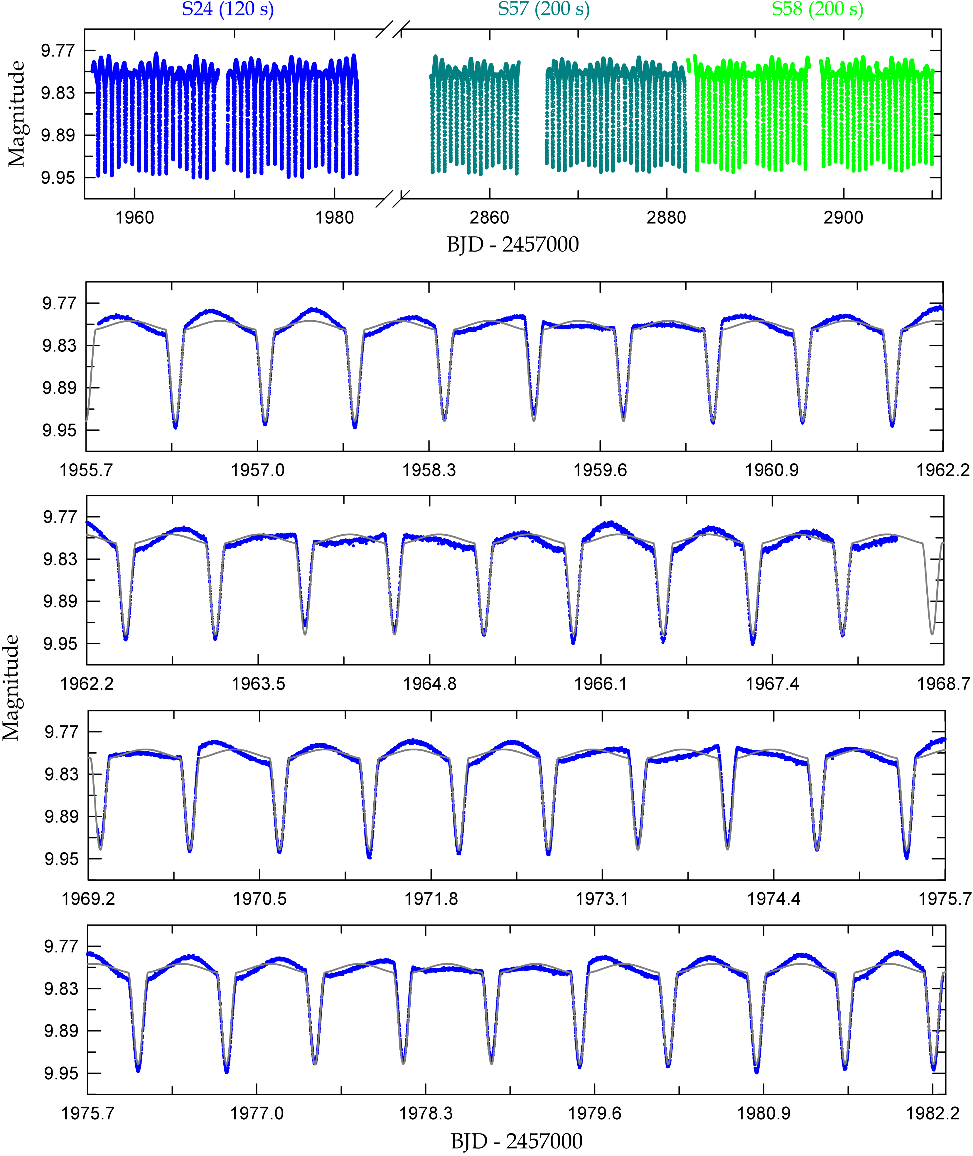 Time-series TESS data of TIC 322208686 observed during Sectors 24 (blue), 57 (cyan), and 58 (green). The top panel shows all observations from the three sectors, and the other panels detail 120 s cadence measurements from Sector 24. The gray lines represent the synthetic model curves computed from our binary star parameters in Table 3.