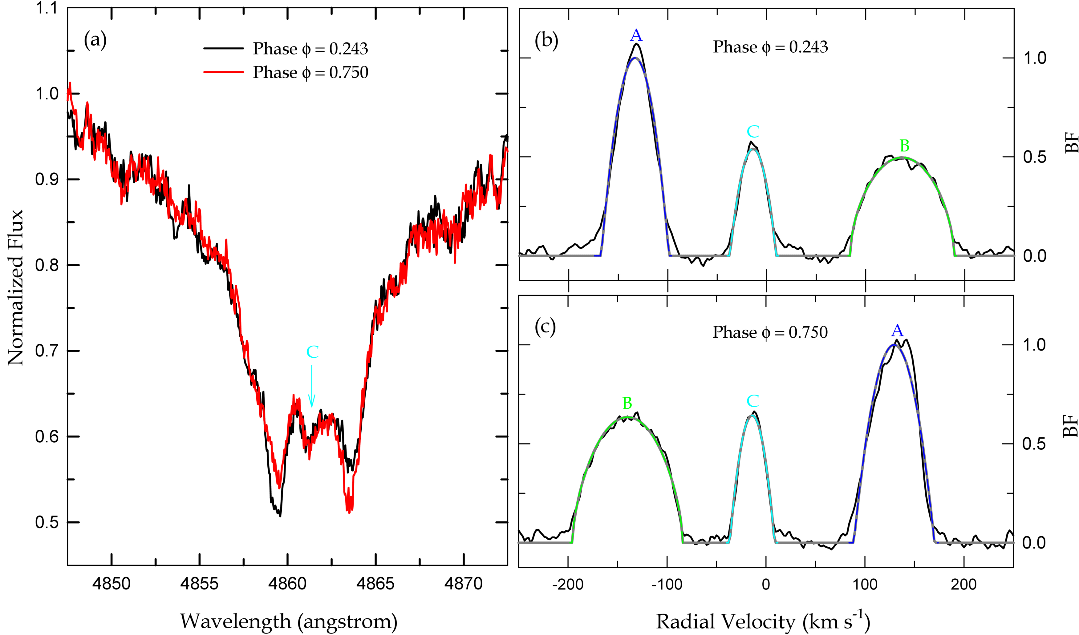 Left panel (a): Hβ-region spectra observed at orbital phases ϕ = 0.243 (BJD 2,460,263.0198) and ϕ = 0.750 (BJD 2,460,260.9902). The signature of the tertiary companion, indicated by an arrow, is well defined between the two absorptions of the eclipsing pair AB. Right panels (b) and (c): BF profiles for the same phases as before obtained using the RaveSpan code. The solid black lines indicate the BF profiles, which exhibit triple peaks and are fitted with three rotational profile functions representing the primary (blue), secondary (green), and third (cyan) components. The gray lines correspond to the combination of these rotational profiles.