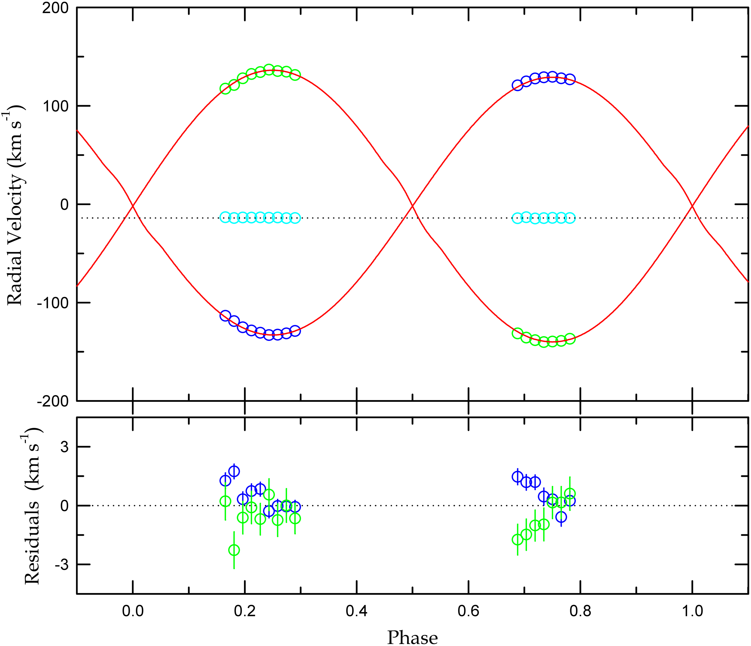 RV curves of TIC 322208686 with fitted models. The blue, green, and cyan circles are the RV measurements for the primary (A), secondary (B), and third (C) components, respectively. The red solid curves represent the results of the W–D binary model, and the dotted line denotes the average RV of −13.86 km s−1 for the third component. The lower panel shows the residuals between observations and models.