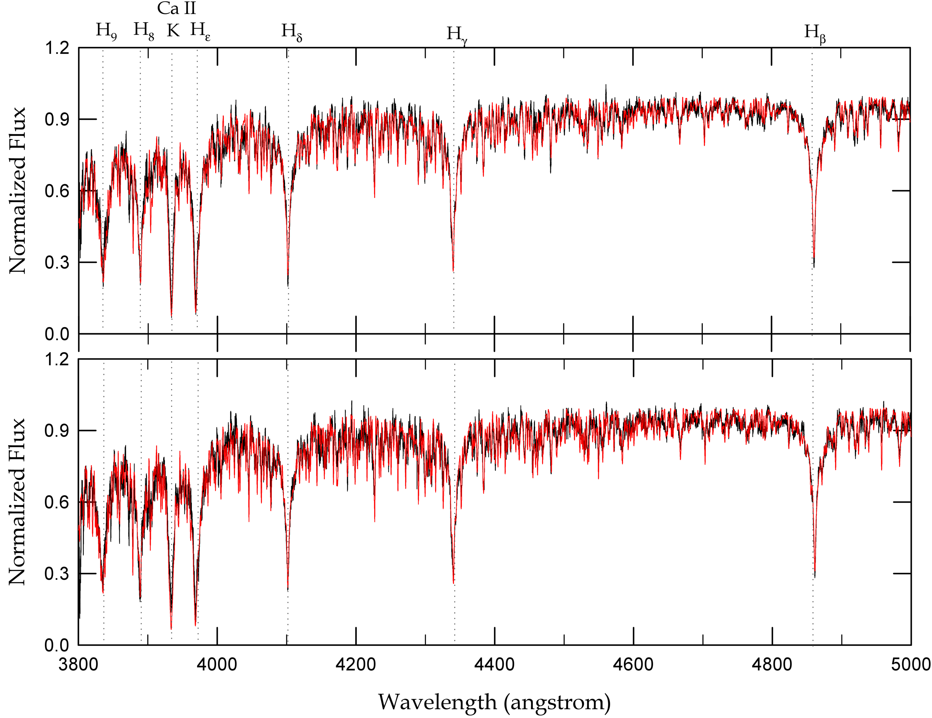 Disentangled spectra of the primary (upper panel) and secondary (lower panel) components for TIC 322208686. The black and red solid lines represent the disentangled and best-fitting synthetic spectra, respectively. The vertical dotted lines represent the spectral lines labeled above the upper panel.