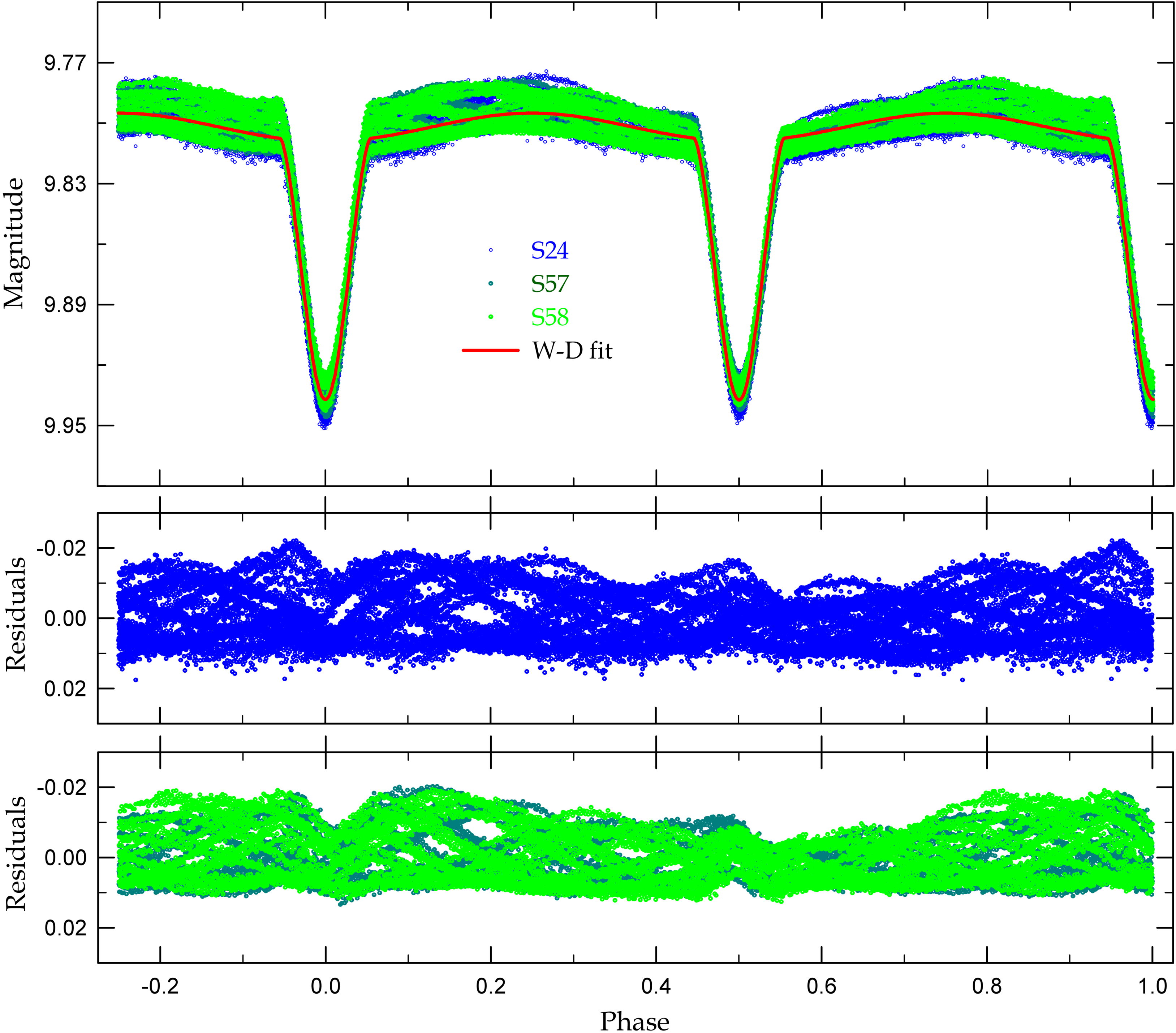 The top panel displays the phased light curve of TIC 322208686 with the fitted model. The blue, cyan, and green circles are the TESS measurements from Sectors 24, 57, and 58, respectively, and the red solid curve is computed with our W-D fit. The middle and bottom panels represent the corresponding residuals for 120 and 200 s cadence data, respectively, from the synthetic curve.