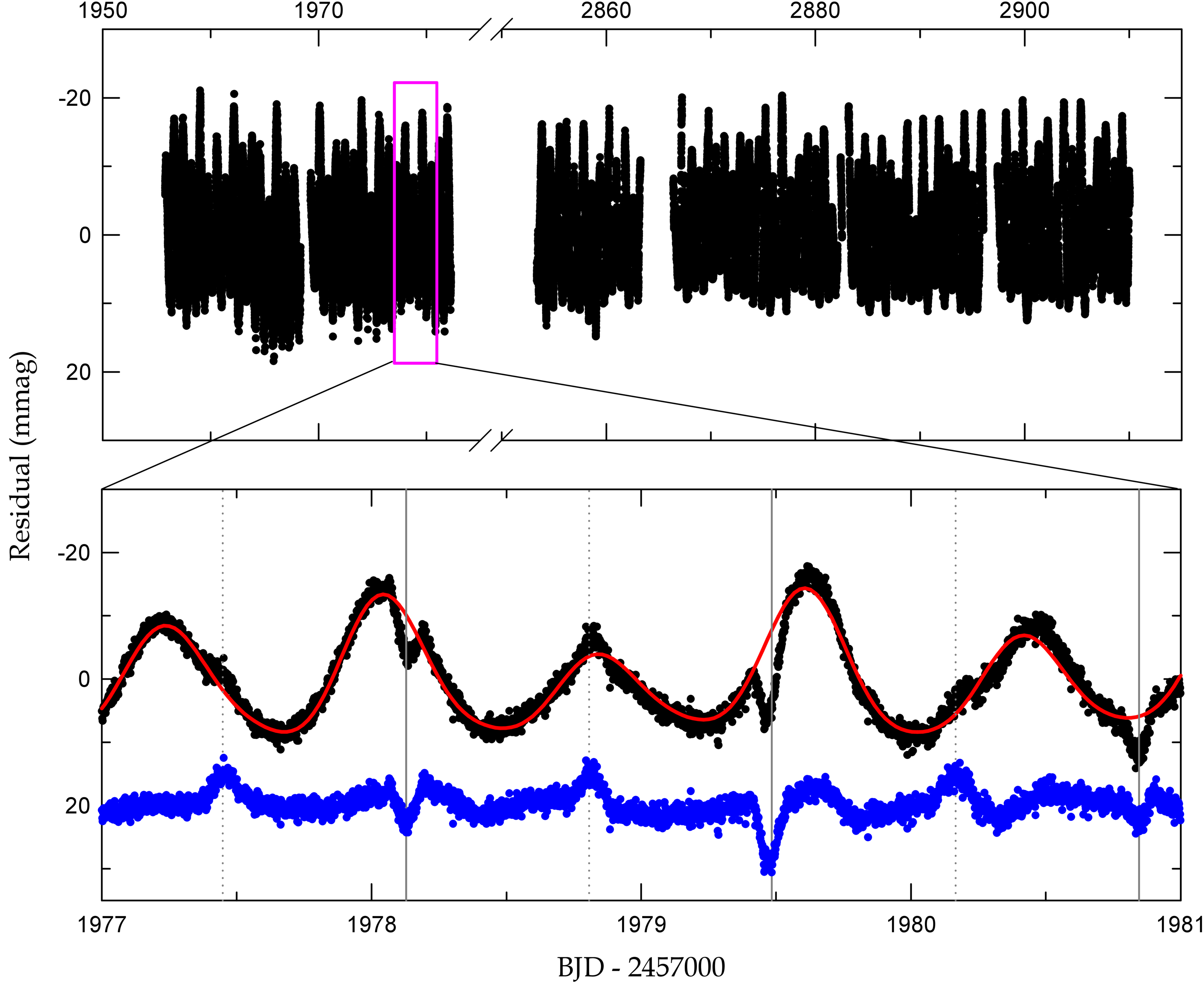 Light curve residuals from the W-D model fit to the TESS data. The lower panel is a zoomed-in view of the residuals shown in the inset box in the upper panel. The red solid line represents the synthetic curve computed from the 11 frequency fit to the out-of-eclipse data. The residuals from the frequency fit are offset from zero by +20 mmag for clarity and are plotted as the blue symbols. The vertical solid and dotted lines indicate the primary and secondary minimum epochs, respectively.