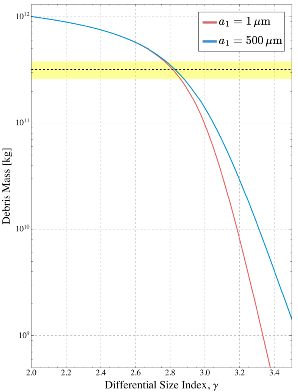 Debris mass of fragment A as a function of differential size index γ. Two lower bound cases are plotted for a1 = 1 μm and a1 = 500 μm. The dashed horizontal line, Md = (3.2 ± 0.6) × 1011 kg, is derived in Paper I, with the highlighted region representing the constraint’s uncertainty.