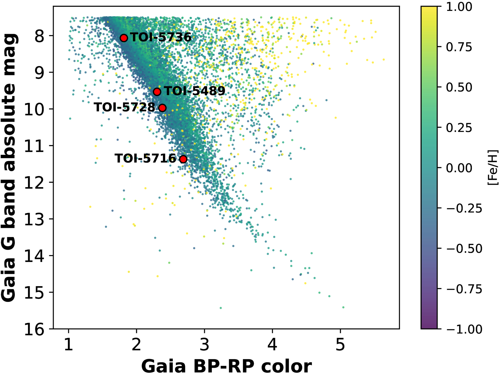Gaia color–magnitude diagram of our targets, along with the catalog of M stars from J. Birky et al. (2020). The data points are color coded by their metallicity from J. Birky et al. (2020). The location of TOI-5716 is consistent with the most metal-poor subset of this population, in good agreement with our spectroscopic analysis.