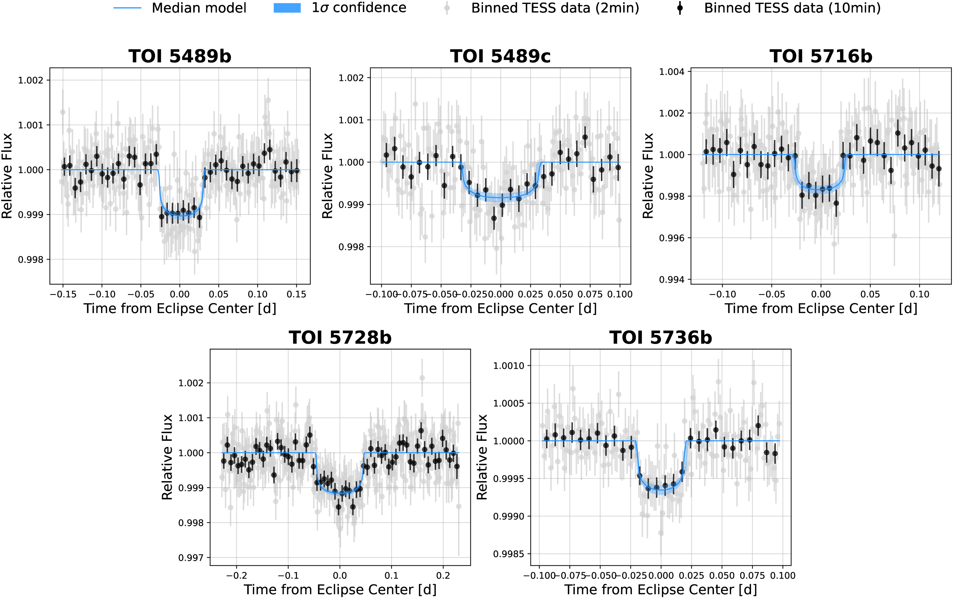 Stacked TESS light curves for our five targets. Gray points show the 2 minute binned data, and black points show the 10 minute binned data. The blue line represents the median transit model from the posterior distribution, with light blue shading indicating the 68% confidence interval.