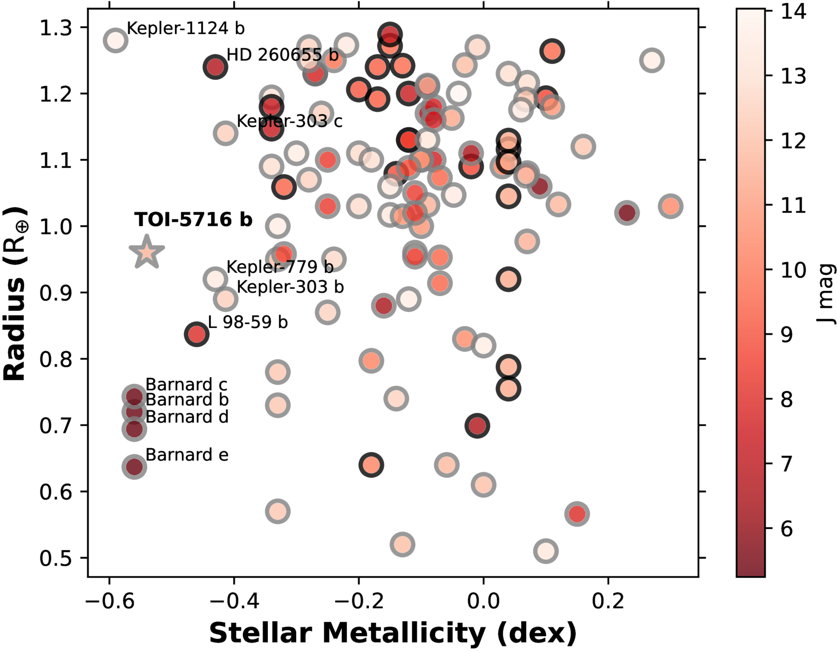 The population of small exoplanets around M dwarf stars (T* < 4000 K) depicting the distribution of stellar metallicities for planet-hosting stars. Planets with published mass measurements >3σ are highlighted in black whereas those without are highlighted in gray. The data points are colored based on their brightness in the J band as a guide for their accessibility to radial velocity measurements.