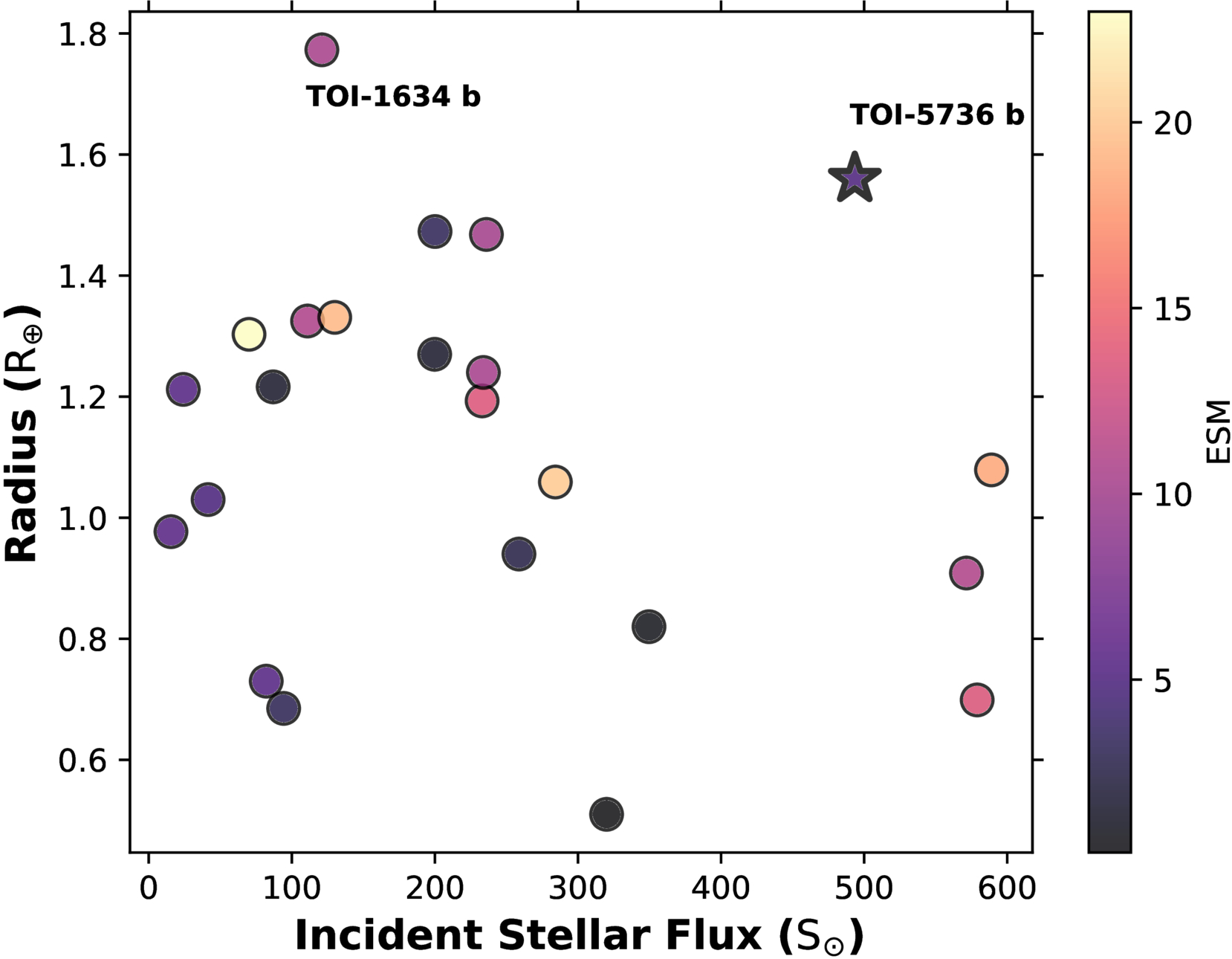 The population of ultrashort-period (P < 1 day) planets smaller than 1.8 R⊕ around M stars. The planets are colored based on their emission spectroscopy metric (ESM). TOI-5736 b has a predicted equilibrium temperature of 1311 K and an ESM of four.