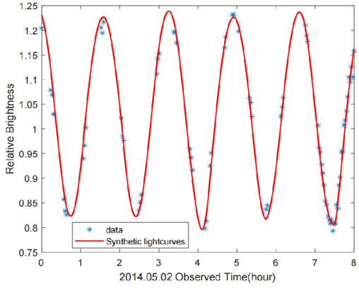 Figure shows the fitting of our derived shape model to the observational data obtained on 2014 May 2. Since the 2014 data were collected during the active period, and the pole orientation and rotation period differ from those derived in 2025, we adopted the updated pole orientation and related parameters.