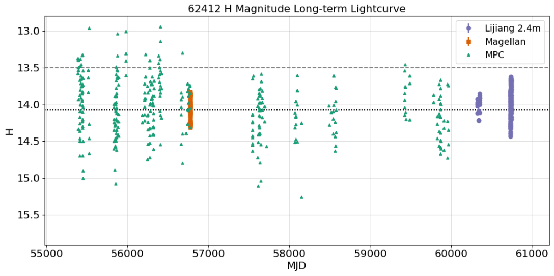 The photometric evolution of 2000 SY178 from 2008 to 2025. Due to factors such as its shape, the brightness variations caused by rotation differ at different epochs. Meanwhile, due to the limited precision of the data provided by the MPC, which are mostly survey data, the results appear rather scattered. In the figure, we marked both the magnitude value of 13.50 adopted by J. R. Masiero et al. (2011) and the average magnitude of 14.07 derived from our fitting.