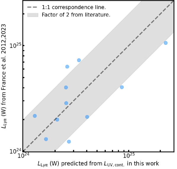 Plot of Lyα luminosities for stars as estimated in Appendix A (x-axis), compared to their Lyα luminosities as reported in K. France et al. (2012, 2023; y-axis). The 1:1 correspondence line is shown in dashed black, and a factor of 2 away from the literature values is shaded in gray.