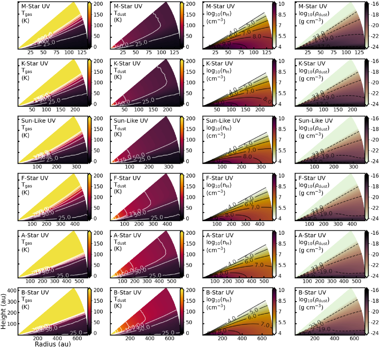 The temperature and density distributions used within the fiducial case for each astrochemical disk model (Section 2.4). From left to right, the columns display the gas temperature (Tgas), dust temperature (Tdust), number gas density of hydrogen nuclei (nH), and total mass density of dust (ρdust). The temperature and density distributions are depicted in linear and ﹩{\mathrm{log}}_{10}﹩ scales, respectively. Temperature contours are shown from 25 K to 125 K in 25 K intervals; number density contours are shown from 104 to 1010 cm−3 in order-of-magnitude intervals; and mass density contours are shown from 10−23 to 10−17 g cm−3 in two-orders-of-magnitude intervals. From top to bottom, the rows display the distributions for each star, in order of increasing stellar mass (Table 1).