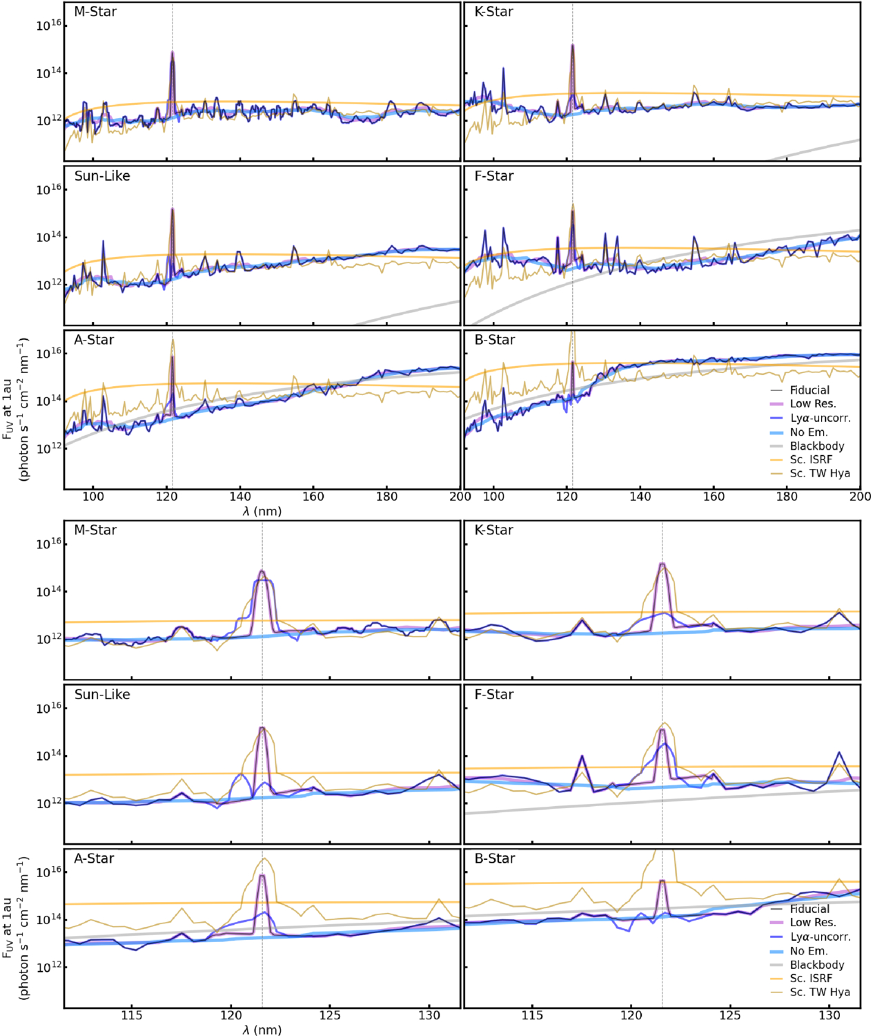 Top panel: ultraviolet spectra and their spectral approximations as a function of wavelength for the six stars in our sample (Table 1). All fiducial ultraviolet spectra (thin black) are originally from the public DIANA database described in Section 2.2, and then, here, they have been updated with estimated Lyα profiles using the methodology described in Section 2.2.1. The six spectral approximations are then overplotted: low-resolution (thick purple), as described in Section 2.3.1; Lyα-uncorrected (thin dark blue), as described in Section 2.2; no emission line (thick light blue), as described in Section 2.3.1; blackbody (thick gray), as described in Section 2.3.2; and scaled TW Hya (thin dark gold) and scaled ISRF (thick pale gold), as described in Section 2.3.3. All spectra have been scaled to a distance of 1 au, consistent with the spectra used to calculate reaction rates in, e.g., A. N. Heays et al. (2017). The Lyα emission line at ∼121.6 nm is marked vertically in dashed gray. Bottom panel: same as the top figure, but zoomed in around the Lyα emission line.