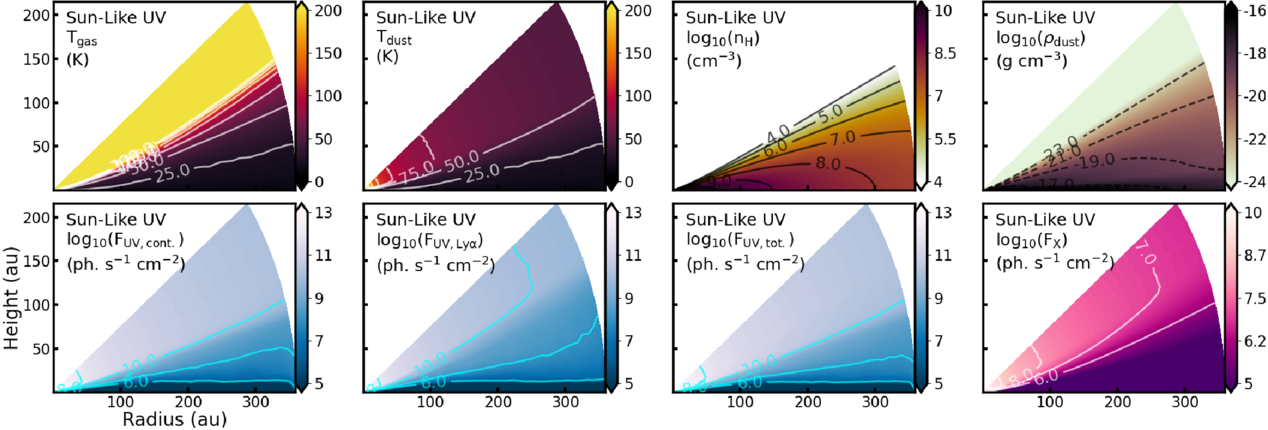 Two-dimensional temperature, density, and radiation distributions (Section 2.4) used within one example astrochemical disk model (the Sun-like model; Table 1); distributions for all other disk models are in Appendix C. Top row: from left to right, the subplots display the gas temperature (Tgas), dust temperature (Tdust), number gas density of hydrogen nuclei (nH), and total mass density of dust (ρdust). The temperature and density distributions are depicted in linear and ﹩{\mathrm{log}}_{10}﹩ scales, respectively. Temperature contours are shown from 25 K to 125 K in 25 K intervals; number density contours are shown from 104 to 1010 cm−3 in order-of-magnitude intervals; and mass density contours are shown from 10−23 to 10−17 g cm−3 in two-orders-of-magnitude intervals. Bottom row: from left to right, the columns display the estimated ultraviolet radiation continuum (FUV,cont.), the subtracted Lyα radiation (FUV,Lyα), the total ultraviolet radiation (FUV,tot.), and the X-ray radiation (FX). All distributions are depicted in ﹩{\mathrm{log}}_{10}﹩ scale. Ultraviolet contours are shown at [106, 108, 1010, 1012] photons s−1 cm−2, and X-ray contours are shown at [106, 107, 108, 109] photons s−1 cm−2.