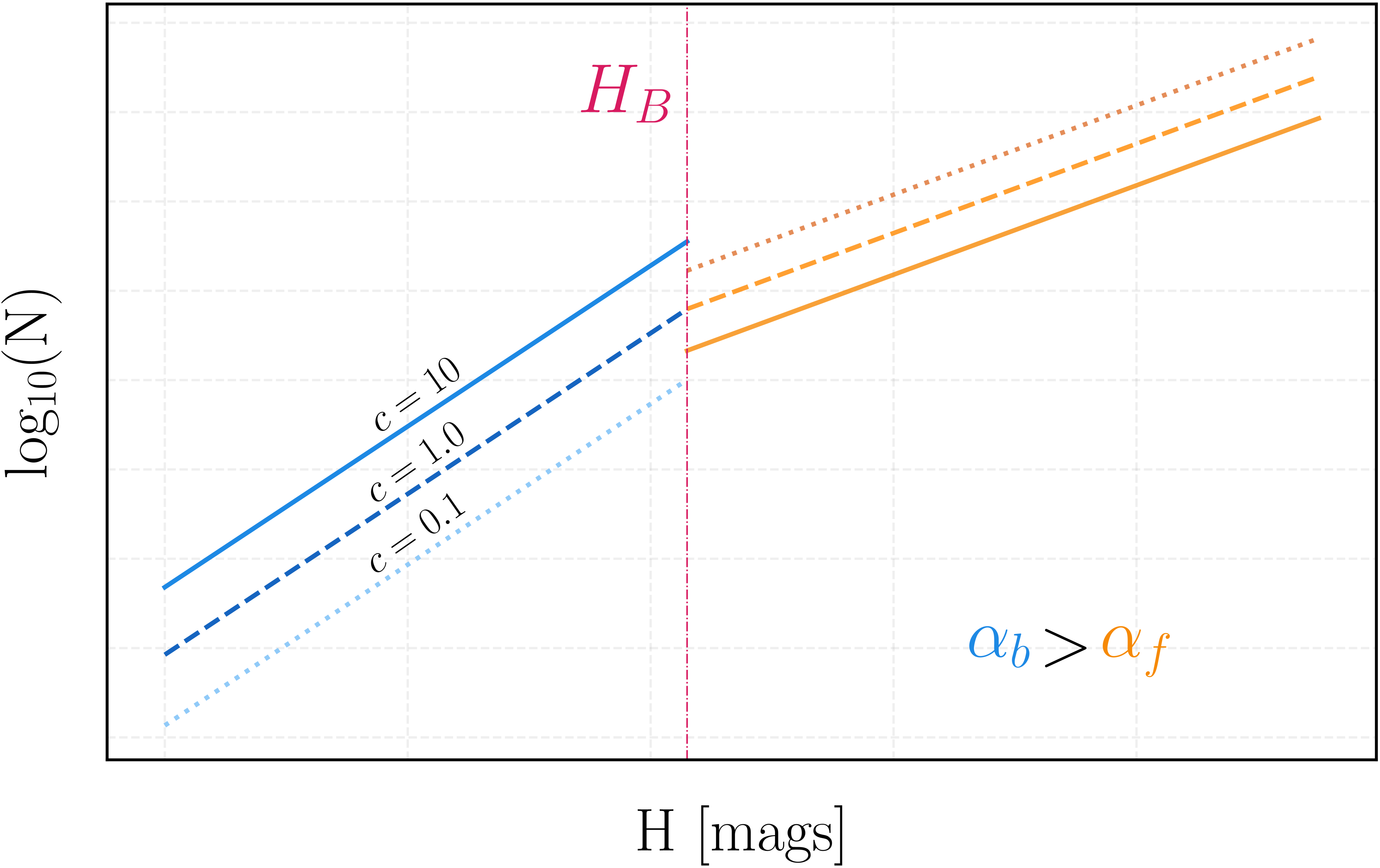 Graphical representation of the differential power law. The “bright” end of the distribution (blue) is quantified by a slope αb, whereas the “faint” end (orange) is quantified by a slope αf (in this plot, αb > αf), with a break at HB. The size of the divot at HB is quantified by a contrast parameter c, that is the ratio of the differential binned objects predivot to the differential binned objects postdivot. For c = 1.0 (dashed), the power law reduces to a broken “knee” form, whereas for c < 1 and c > 1, a “divot” power law occurs, either increasing (dotted) or decreasing (solid) the number of objects postbreak, respectively.