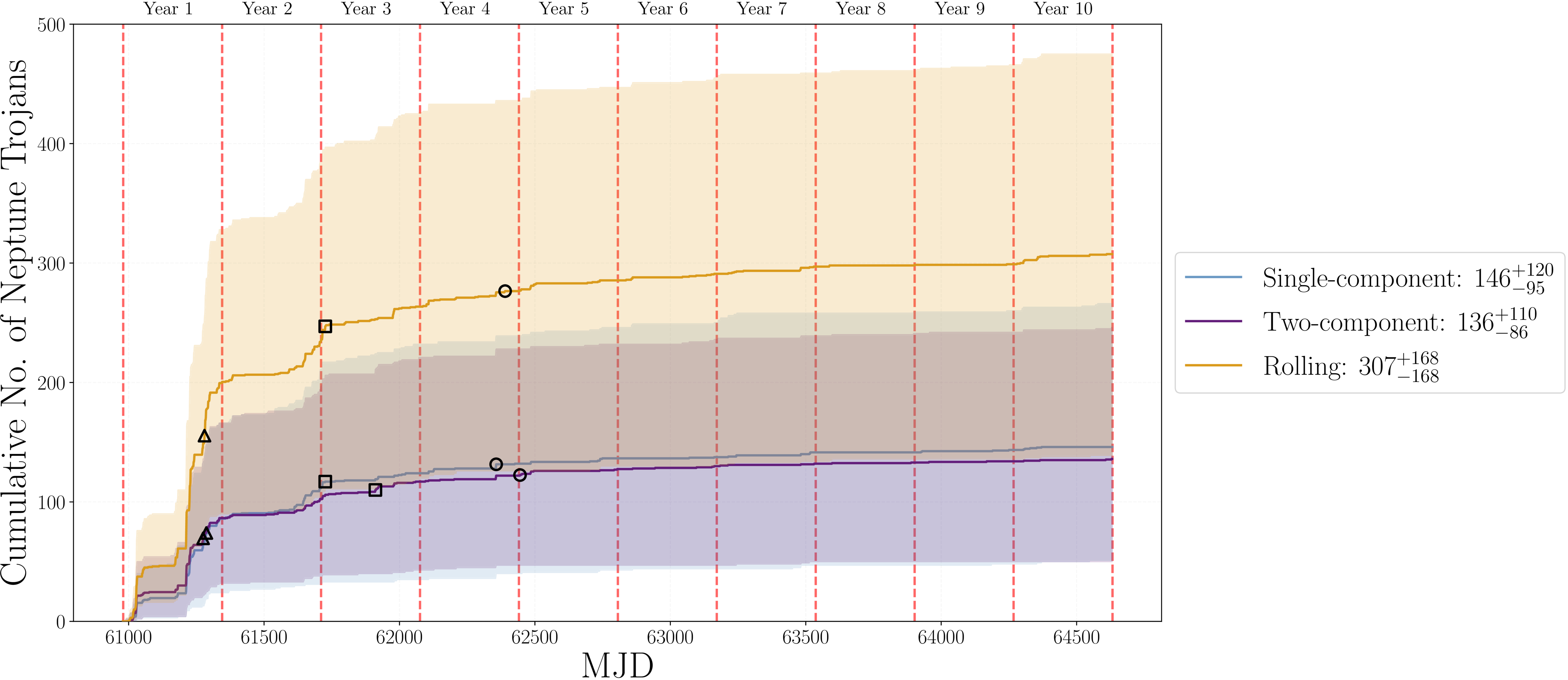 Cumulative histogram (with a bin size of one day) of the discovery rates over the 10 yr LSST lifetime for the single-component (blue), two-component (purple), and rolling power-law (orange) models. The points of 50% (open triangle) 80% (open square), and 90% (open circle) completion are shown for each model. Red dashed vertical lines represent survey year start/end points. The ranges here represent the upper and lower estimate for the scaling parameters used in each model, described in Section 2.3.1.