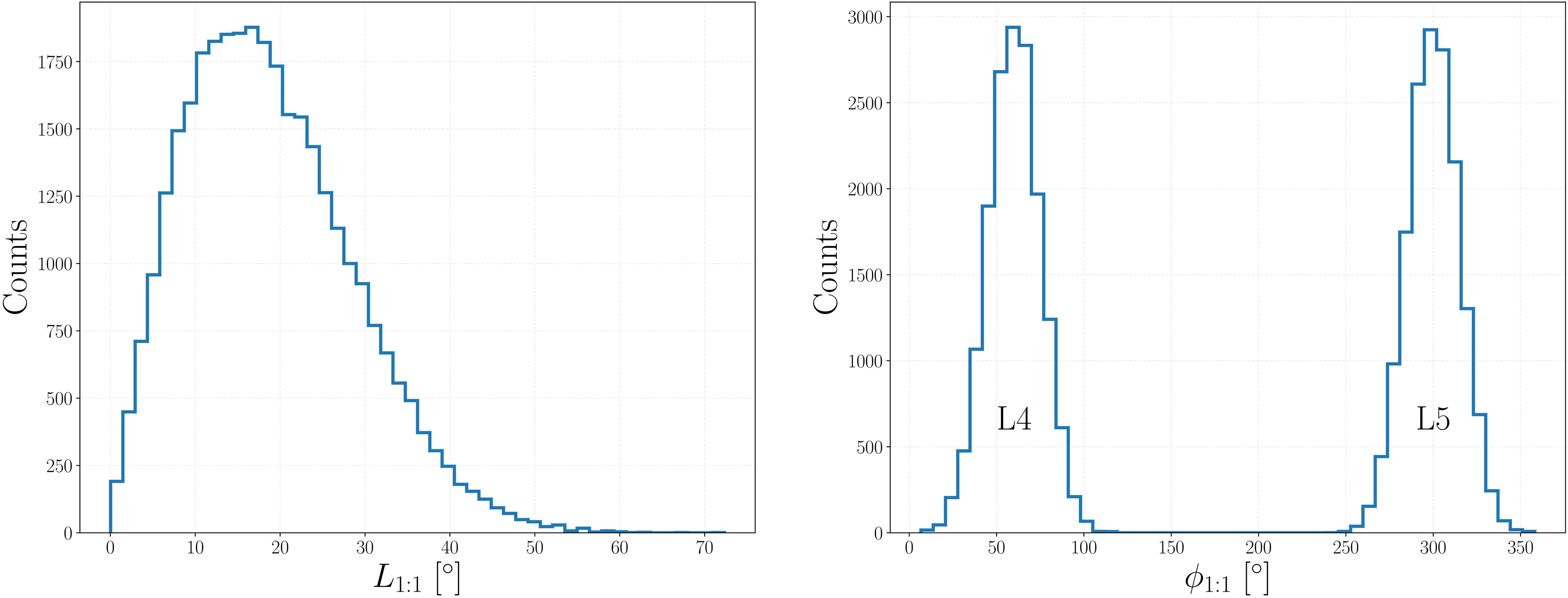 Example distributions of libration angle L1:1 and resonance argument ϕ1:1 used for all three H models. All three models share the same distribution shapes for L1:1 and ϕ1:1, differing only in the number of objects sampled from them.