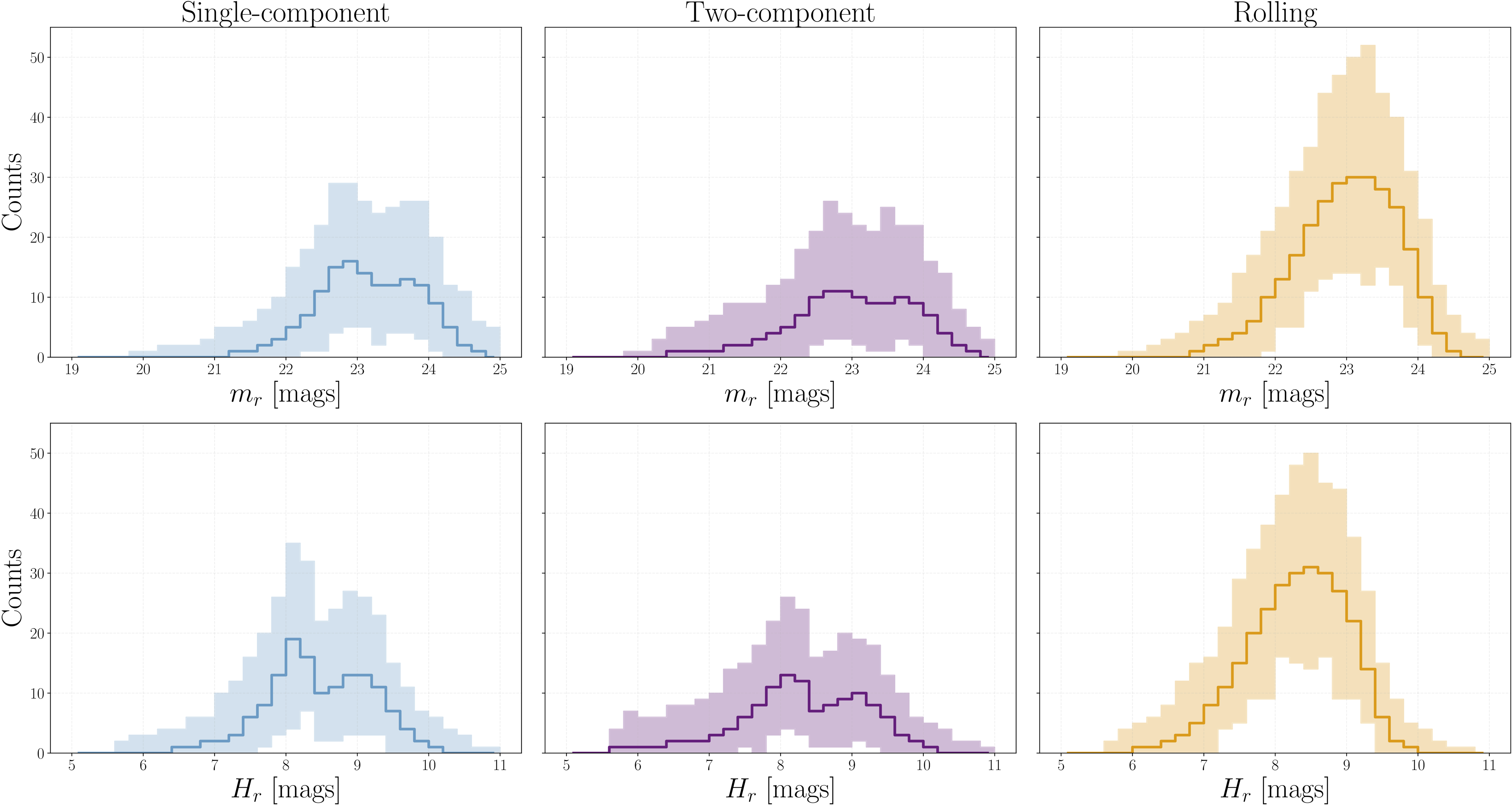 Final 10 yr differential histograms of (top row) the median apparent magnitude distribution in the r band at the time of linkage of detected NTs for the three input models, and (bottom row) the median absolute magnitude in the r band of all detected NTs. The shaded region in each panel represents the uncertainty on all 103 simulations.