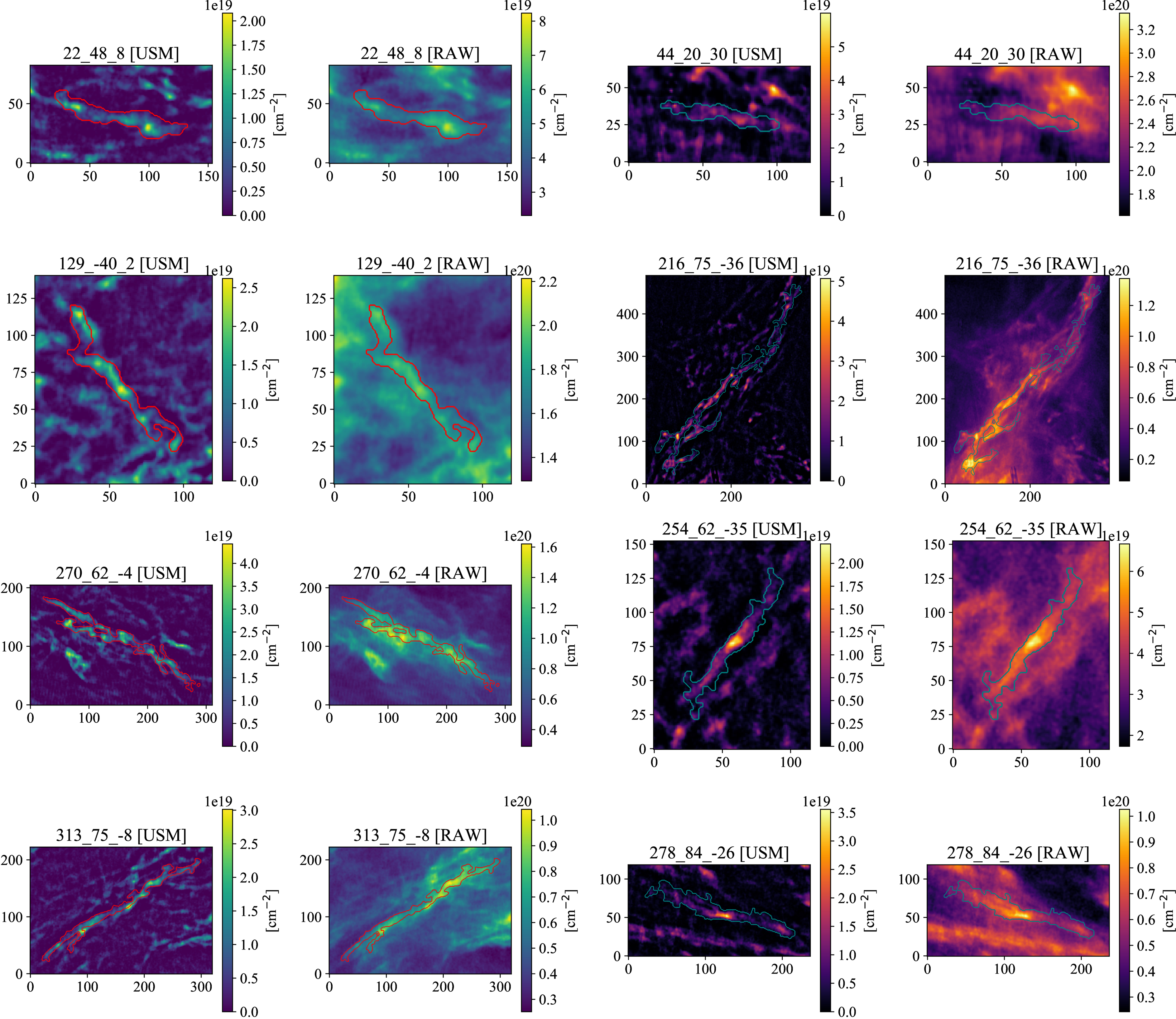Moment 0 maps of example 3D H I filaments from the local (left two columns) and disk–halo (right two columns) populations. The red and green contour lines are the filament masks as identified by fil3d and the background is the USM GALFA-HI data (labeled “USM”) for the first column of each population and the original raw data for the second column (labeled “RAW”), integrated over the FWHM velocity width. The axes are in pixels which are 1﹩{}^{{\prime} }﹩. It is evident that the USM successfully extracts the filaments, but also removes a diffuse component that affects the derived column densities and widths.